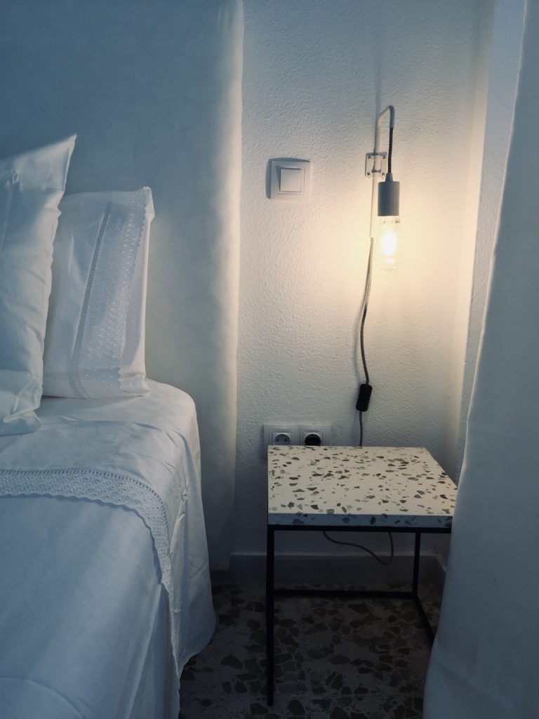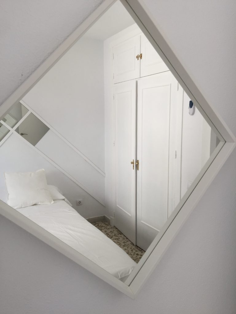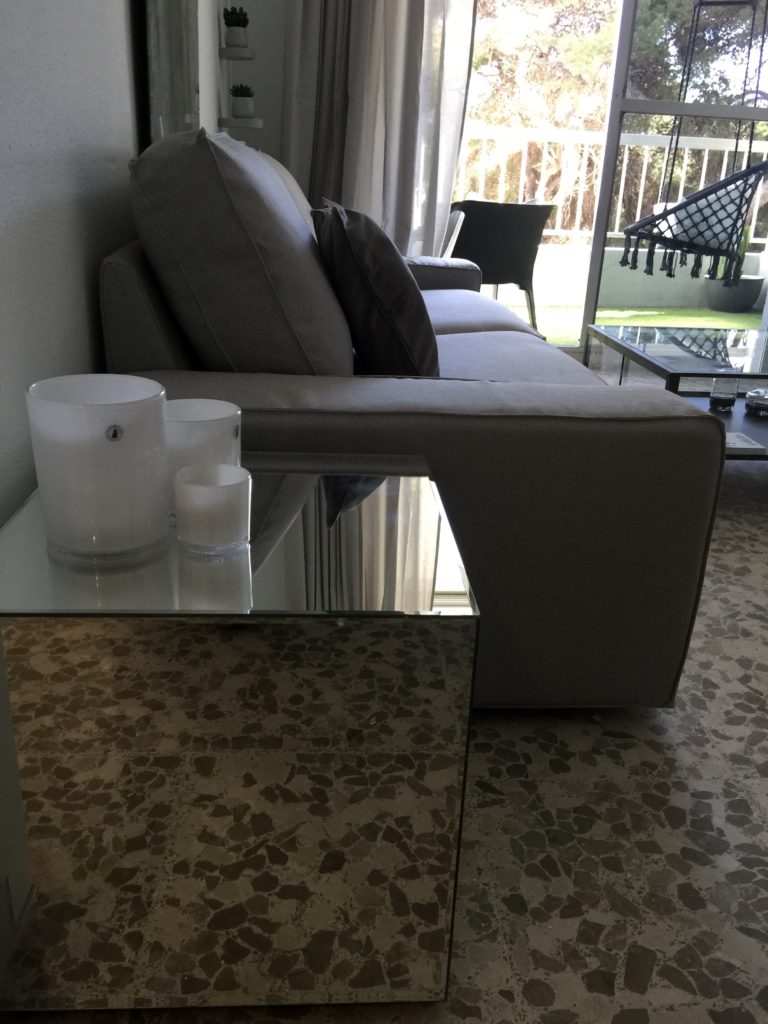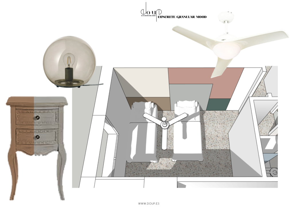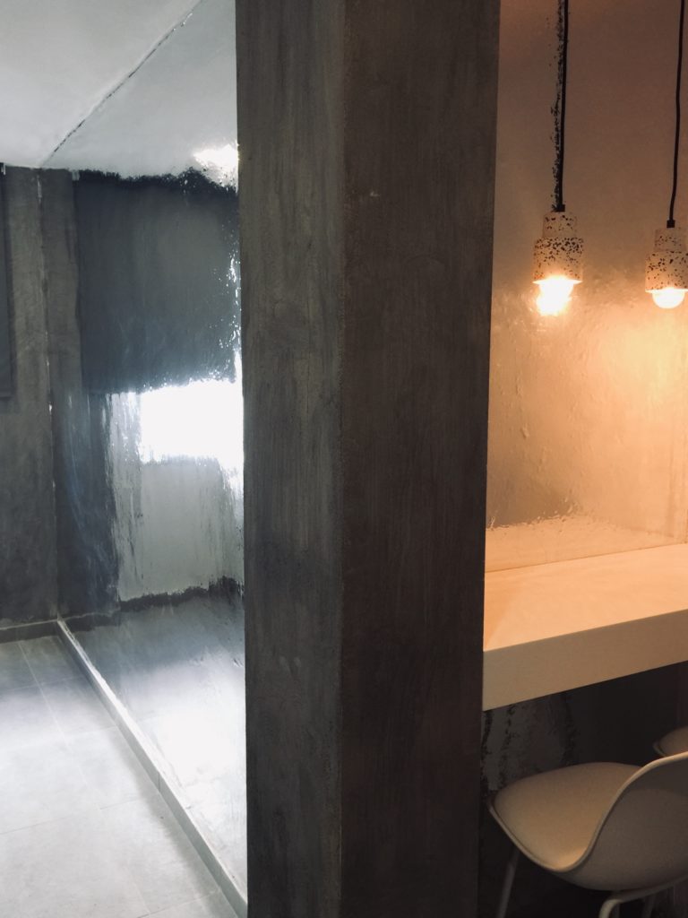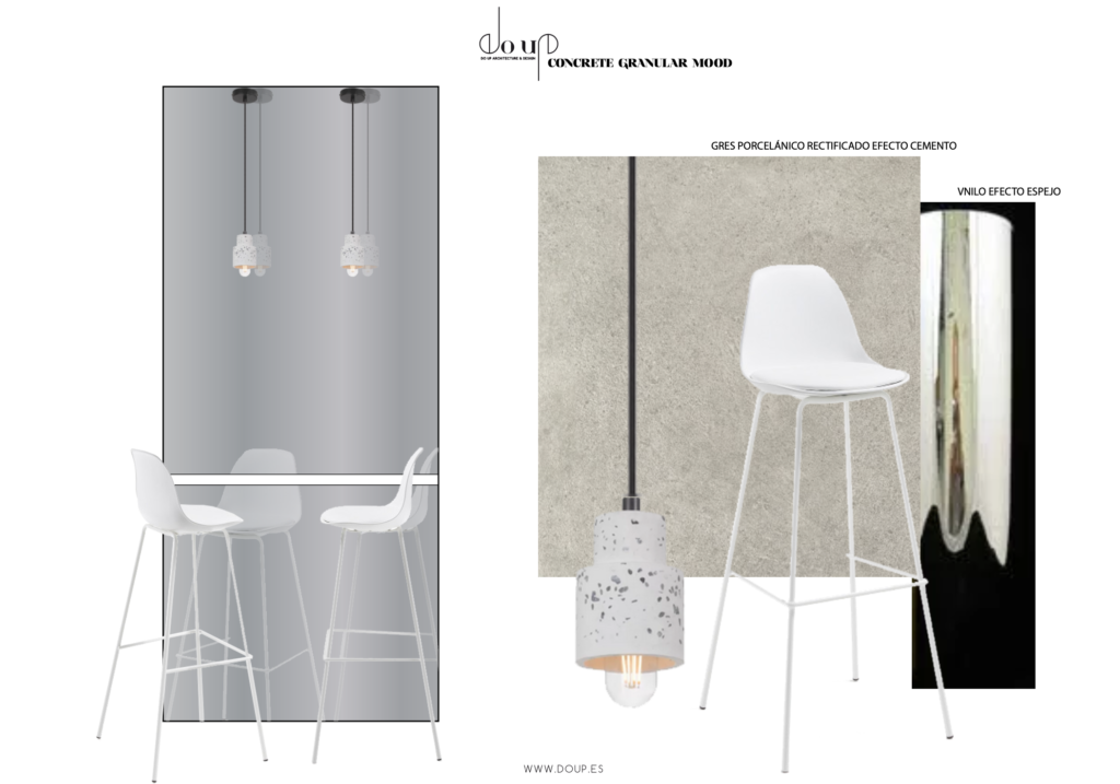 La materialidad en el proyecto. Los materiales toman importancia y dan vida a esta reforma de una vivienda turística frente al mar. Suelo de terrazo existente, que se integra a la perfección con los elementos de hoy, y no sólo se integra, sino que llega a ser protagonista. Estructura en cemento visto, decimos adiós al alicatado de paredes y dejamos ver el interior. Espejos que reflejan y dan amplitud a las estancias.