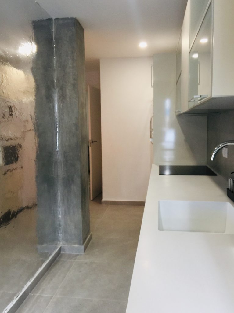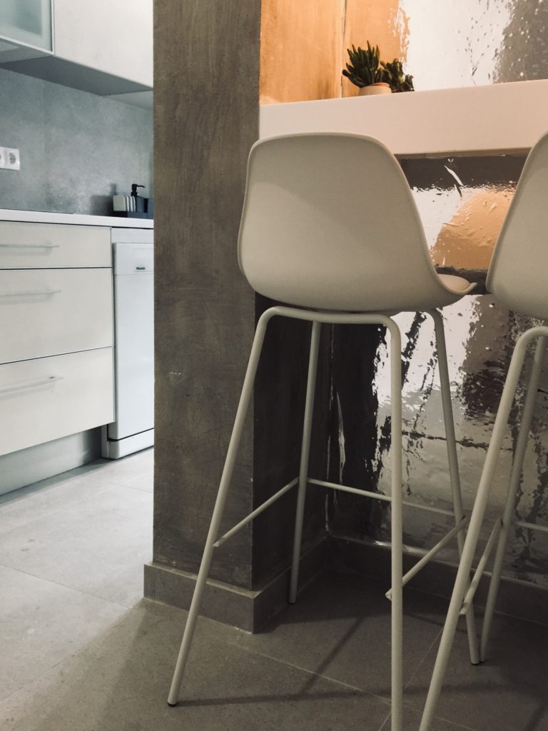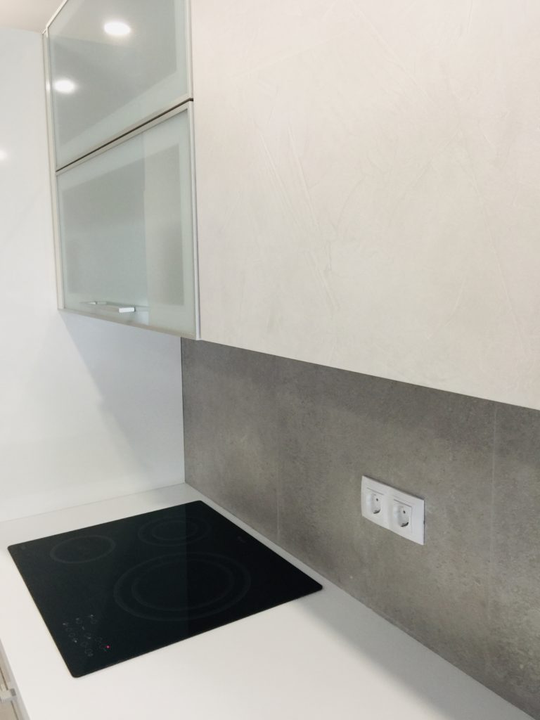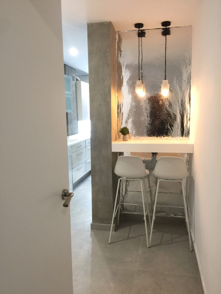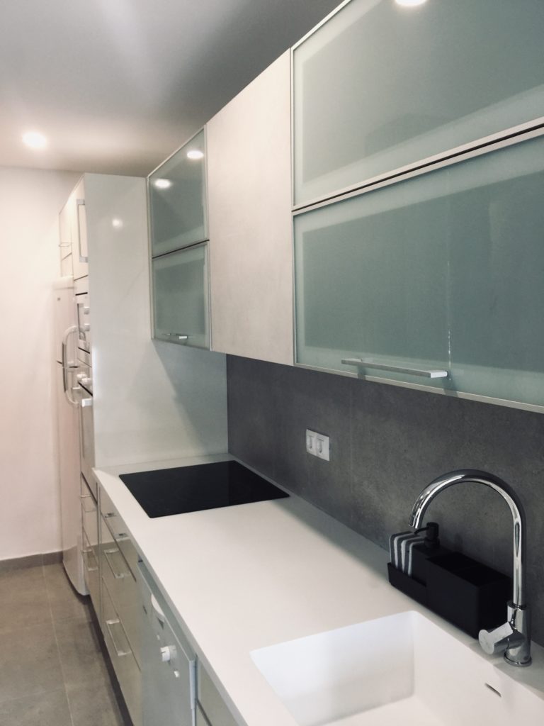 La cocina antes y después. Vinilo efecto espejo, gres porcelánico efecto cemento, pilares vistos de hormigón, encimera en Krion blanco.