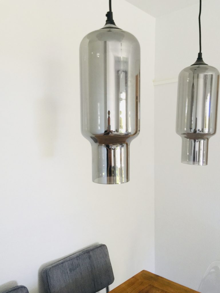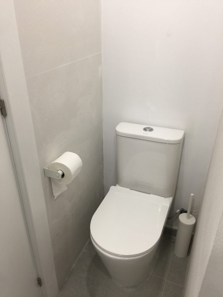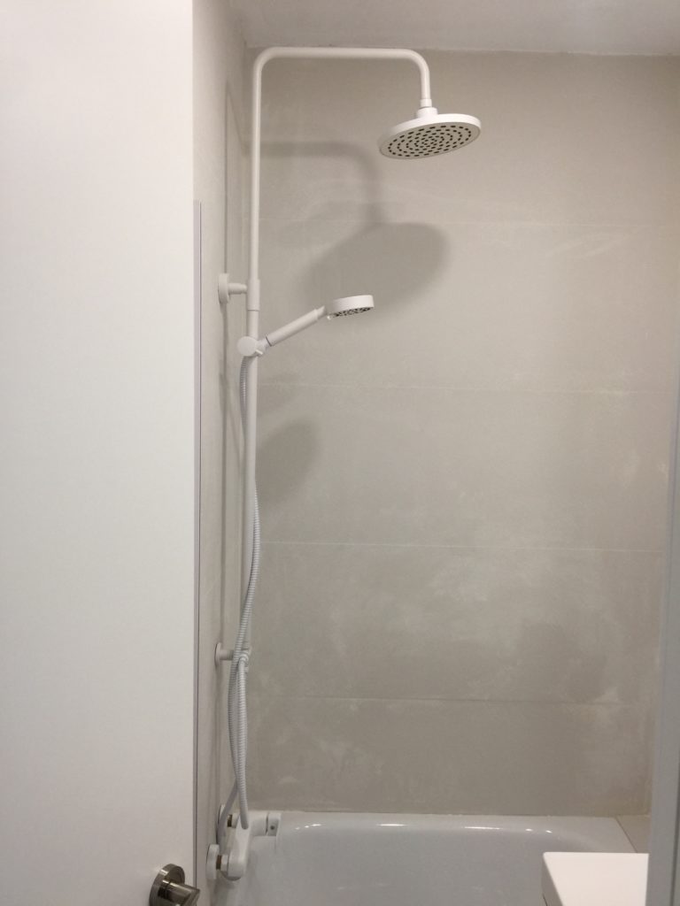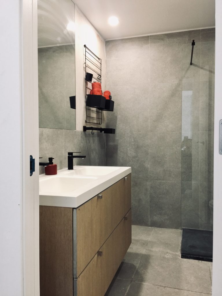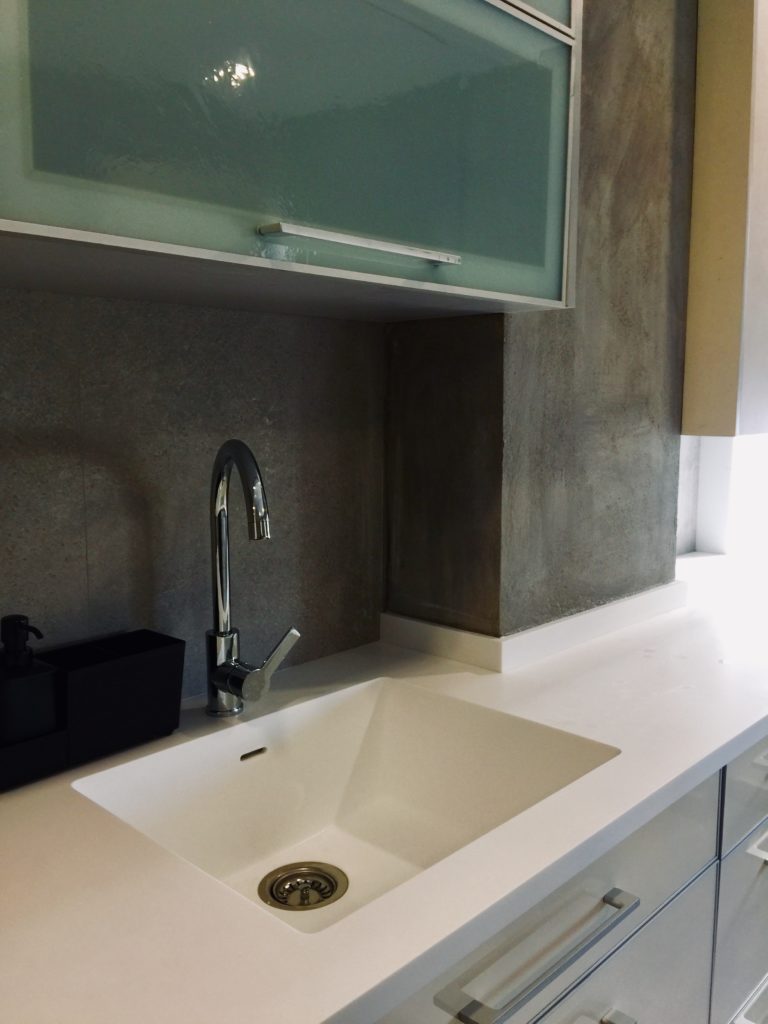 La cocina antes y después. Vinilo efecto espejo, gres porcelánico efecto cemento, pilares vistos de hormigón, encimera en Krion blanco.