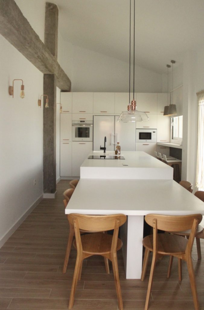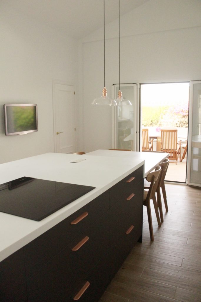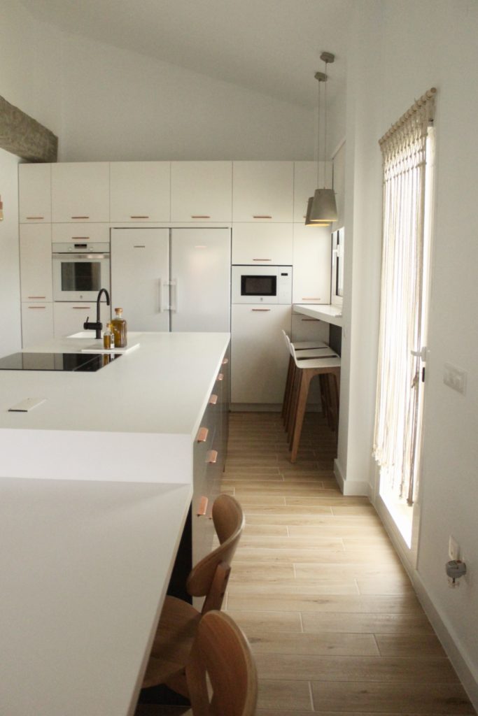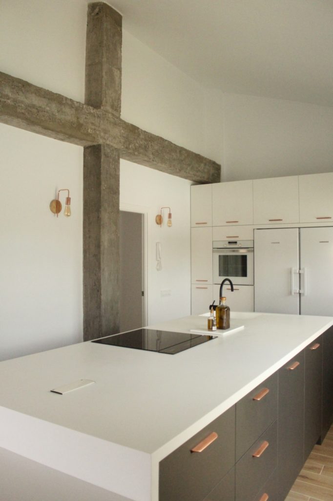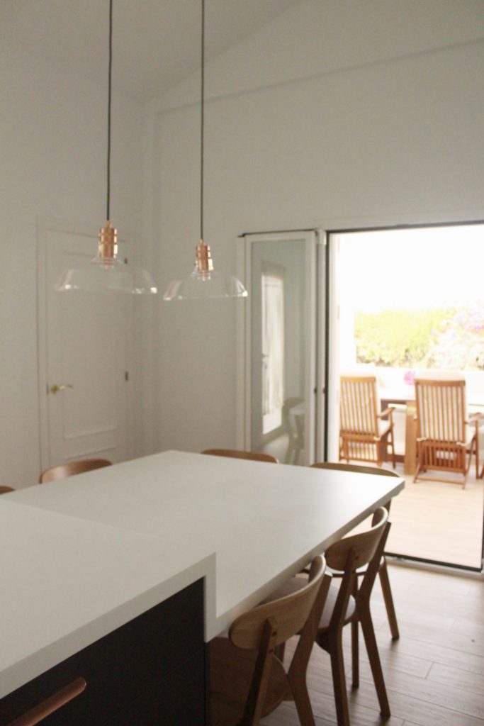 La cocina sin duda es el espacio más singular y espectacular de la vivienda, puesto que consta de cinco puertas de acceso a diferentes espacios, pasillo de entrada, piscina, lavadero, porche y salón. Por este motivo optamos por hacer una isla central en la que se sitúa toda la zona de trabajo, con la vitro, campana extraíble y fregadero. Cubierta de una encimeria de Krion que termina en una mesa con soporte en T del mismo material. En el fondo se han colocado todos los muebles altos como frigorífico, horno y microondas. La viga y pilar se han dejado visto de hormigón y la gama de color se encuentra entre el gris el blanco y el color oro rosado en tiradores, apliques y lámparas. Bajo la ventana de la cocina se ha colocado una barra de desayuno también de Krion.
