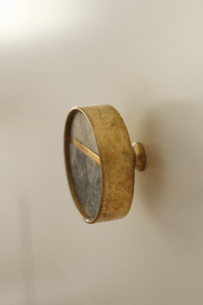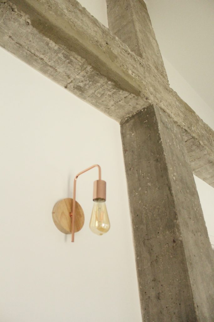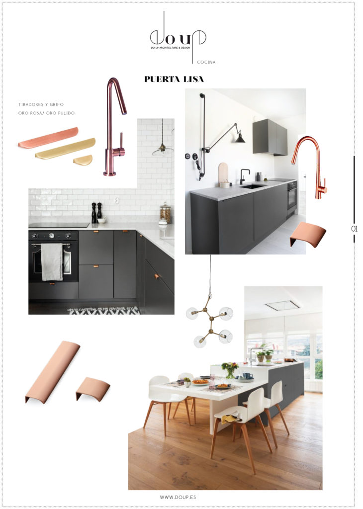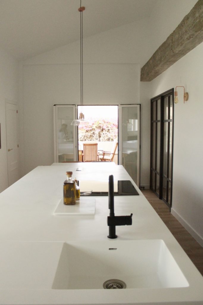 La cocina sin duda es el espacio más singular y espectacular de la vivienda, puesto que consta de cinco puertas de acceso a diferentes espacios, pasillo de entrada, piscina, lavadero, porche y salón. Por este motivo optamos por hacer una isla central en la que se sitúa toda la zona de trabajo, con la vitro, campana extraíble y fregadero. Cubierta de una encimeria de Krion que termina en una mesa con soporte en T del mismo material. En el fondo se han colocado todos los muebles altos como frigorífico, horno y microondas. La viga y pilar se han dejado visto de hormigón y la gama de color se encuentra entre el gris el blanco y el color oro rosado en tiradores, apliques y lámparas. Bajo la ventana de la cocina se ha colocado una barra de desayuno también de Krion.