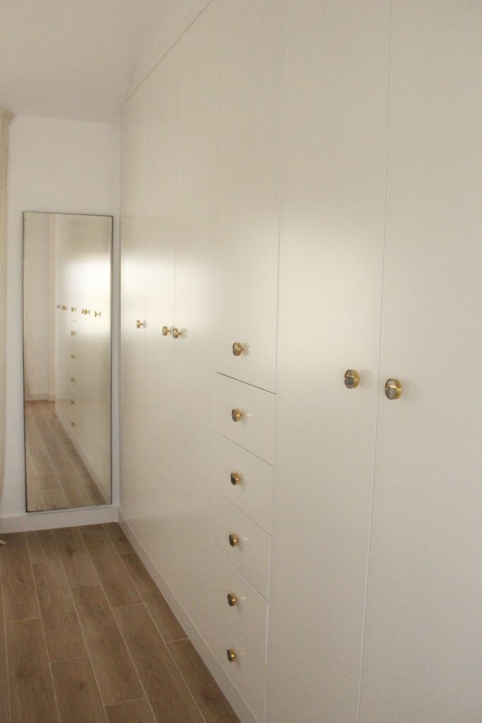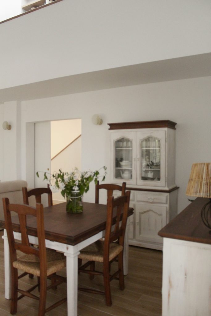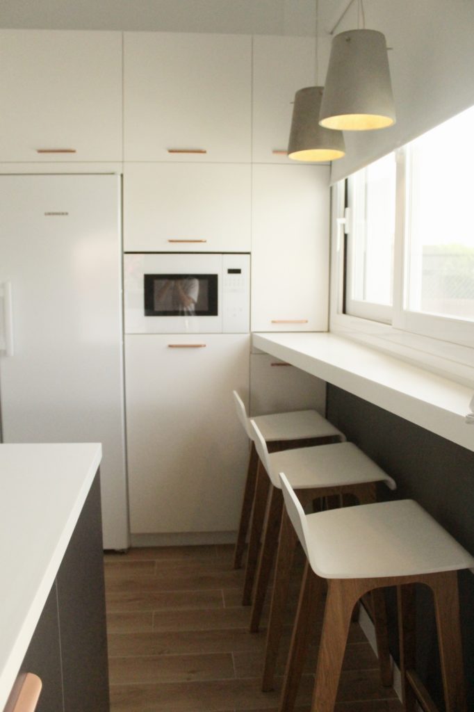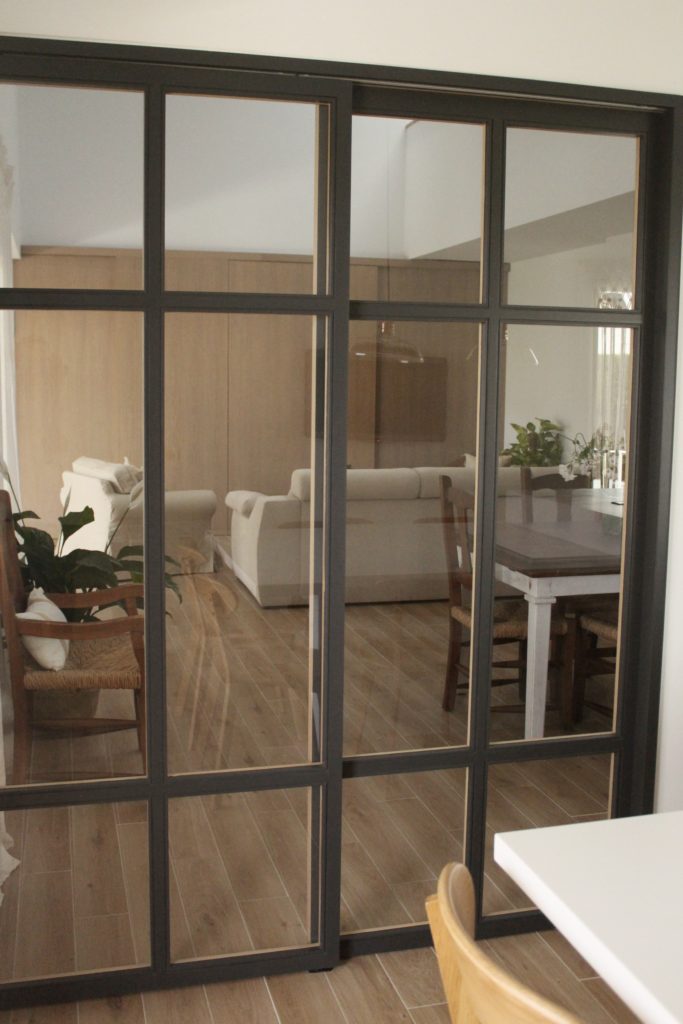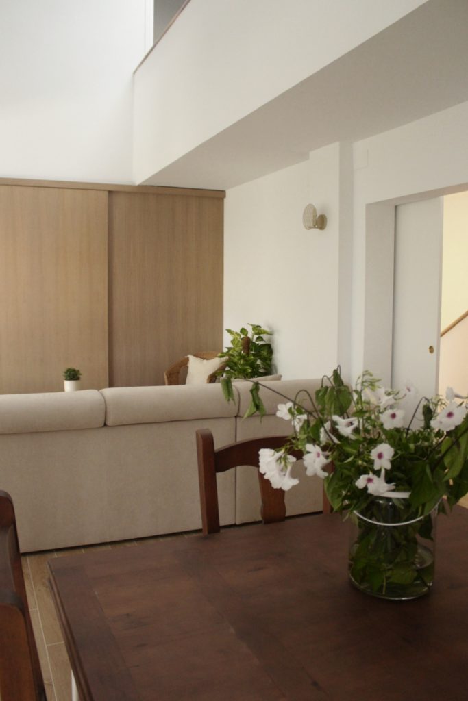 El salón consta de dos ambientes diferenciados, la zona de comedor y la zona de TV. En este caso en la zona de comedor se han aprovechado los muebles de los clientes que se han pintado en un blanco chalk paint para darle un aire más actual y fresco. La zona de comedor se encuentra junto a la cocina a la que se accede por una puerta corredera de cristal y madera a medida. El acabado de esta puerta es de madera natural por la zona del comedor y gris oscuro por la zona de la cocina.