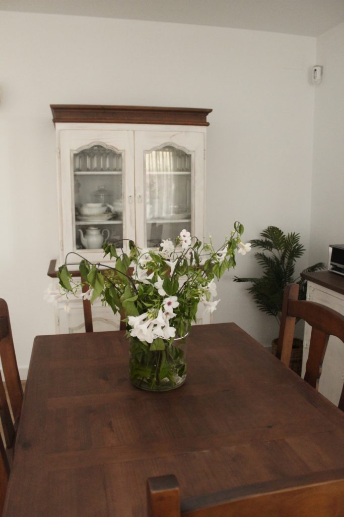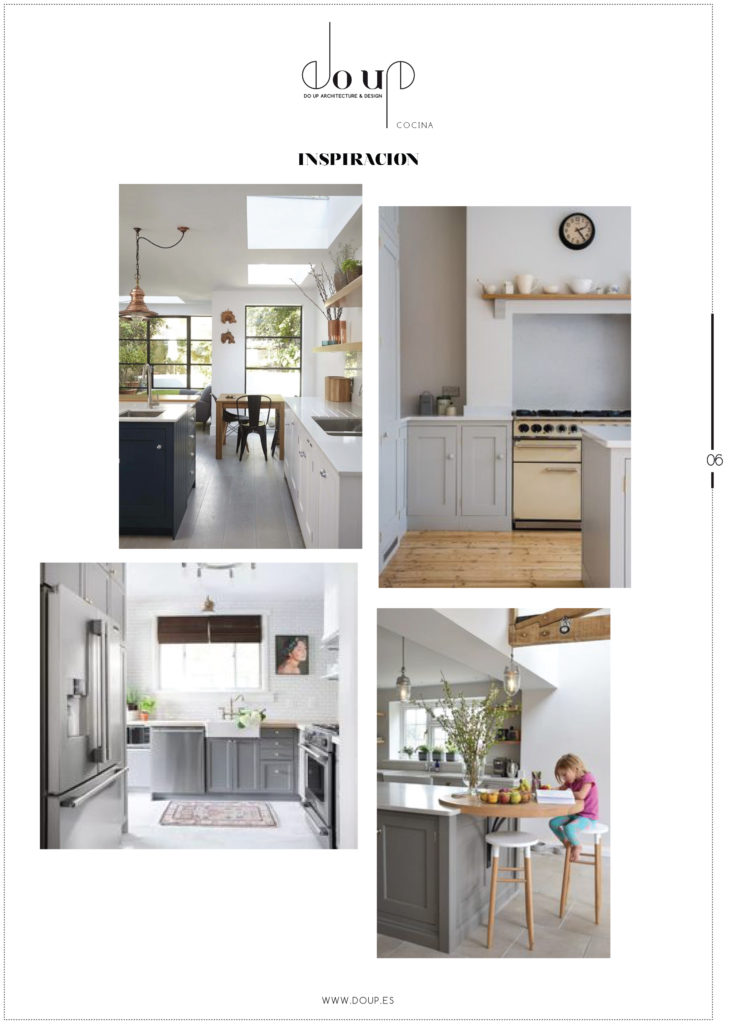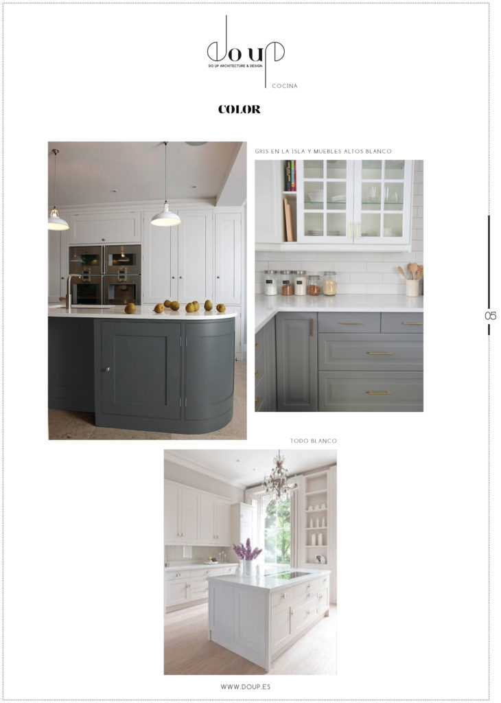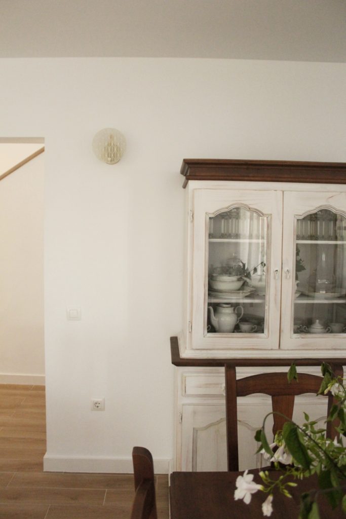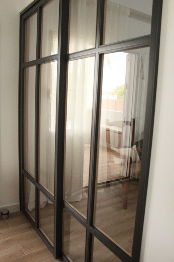 El salón consta de dos ambientes diferenciados, la zona de comedor y la zona de TV. En este caso en la zona de comedor se han aprovechado los muebles de los clientes que se han pintado en un blanco chalk paint para darle un aire más actual y fresco. La zona de comedor se encuentra junto a la cocina a la que se accede por una puerta corredera de cristal y madera a medida. El acabado de esta puerta es de madera natural por la zona del comedor y gris oscuro por la zona de la cocina.