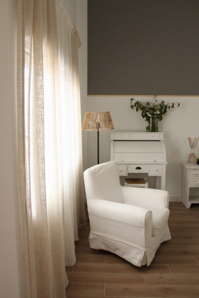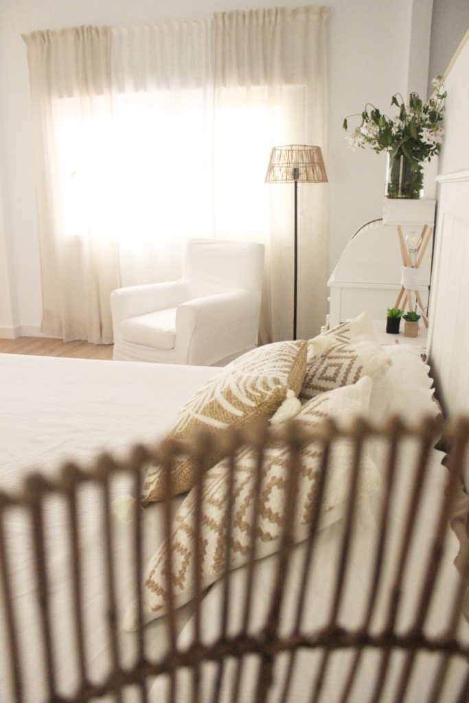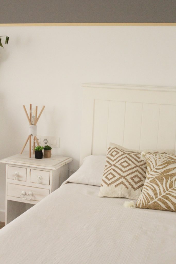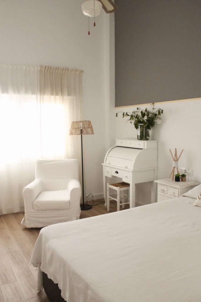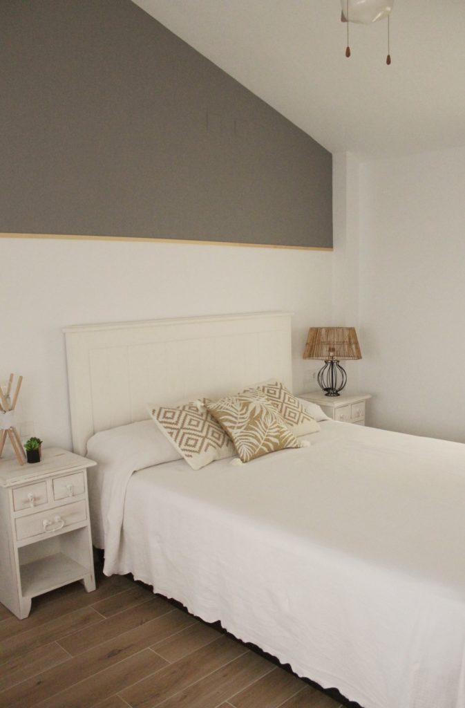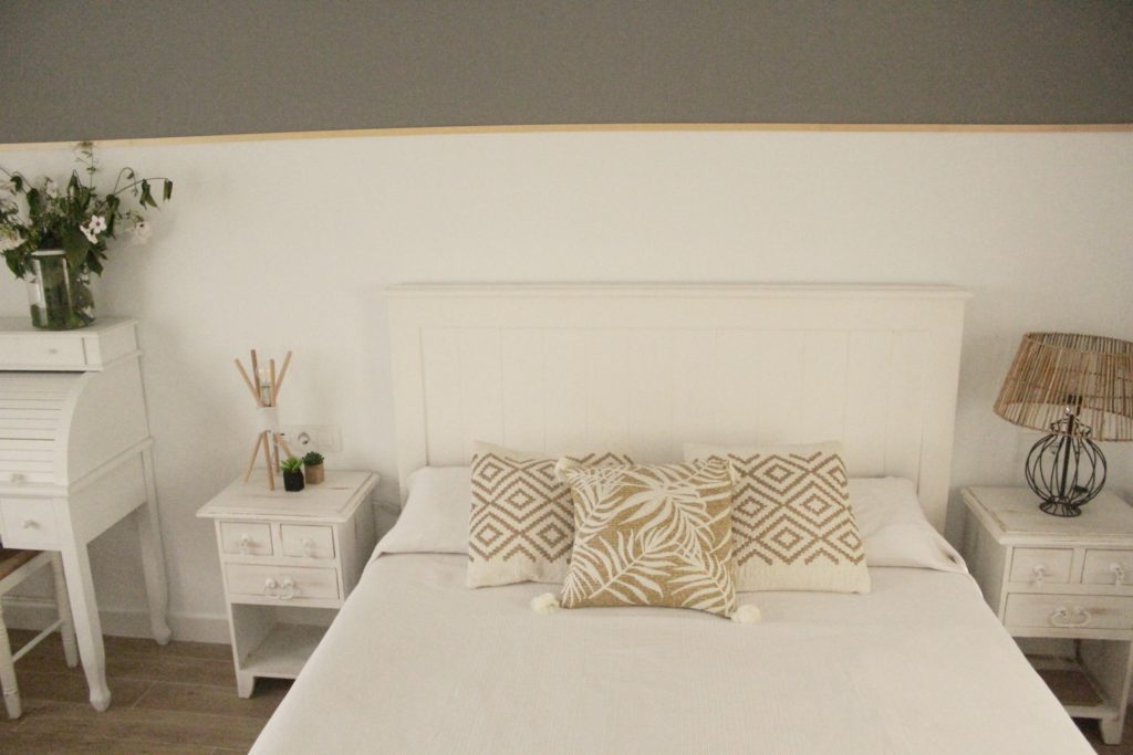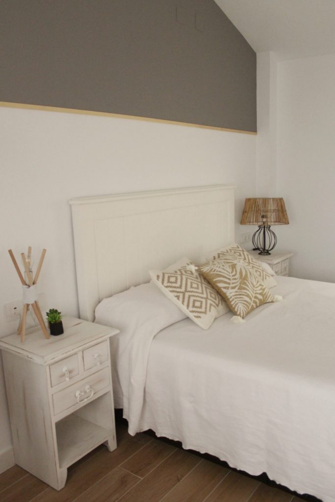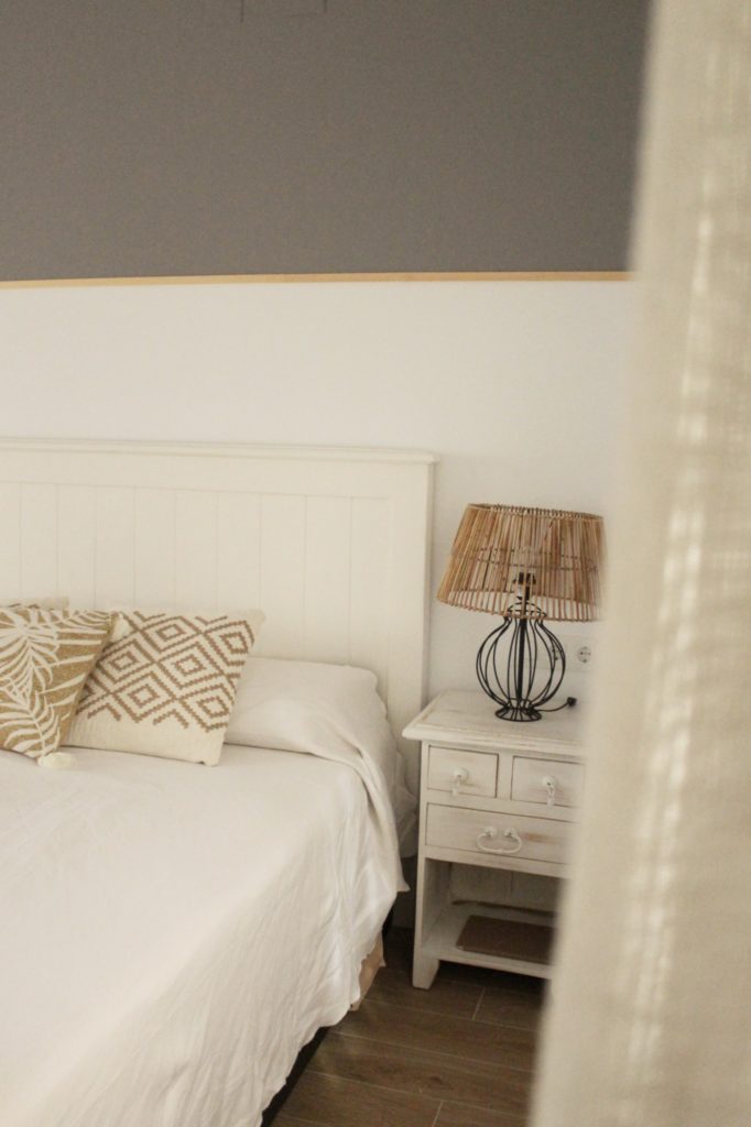 El dormitorio principal consta de un armario a medida con puertas lacadas en blanco. El cabecero se ha lacado en blanco liso y las mesitas se han lacado en blanco envejecido chalk paint. En la pared hemos pintado una franja en gris para modernizar el entorno. Las Cortinas de Lino y colcha de algodón se ha combinado con cojines de texturas naturales de Maisons du Monde .