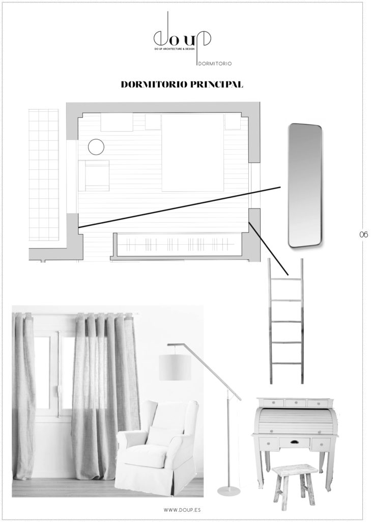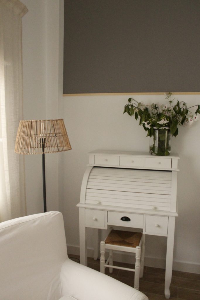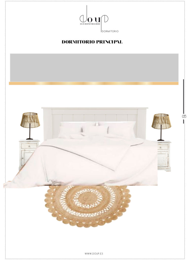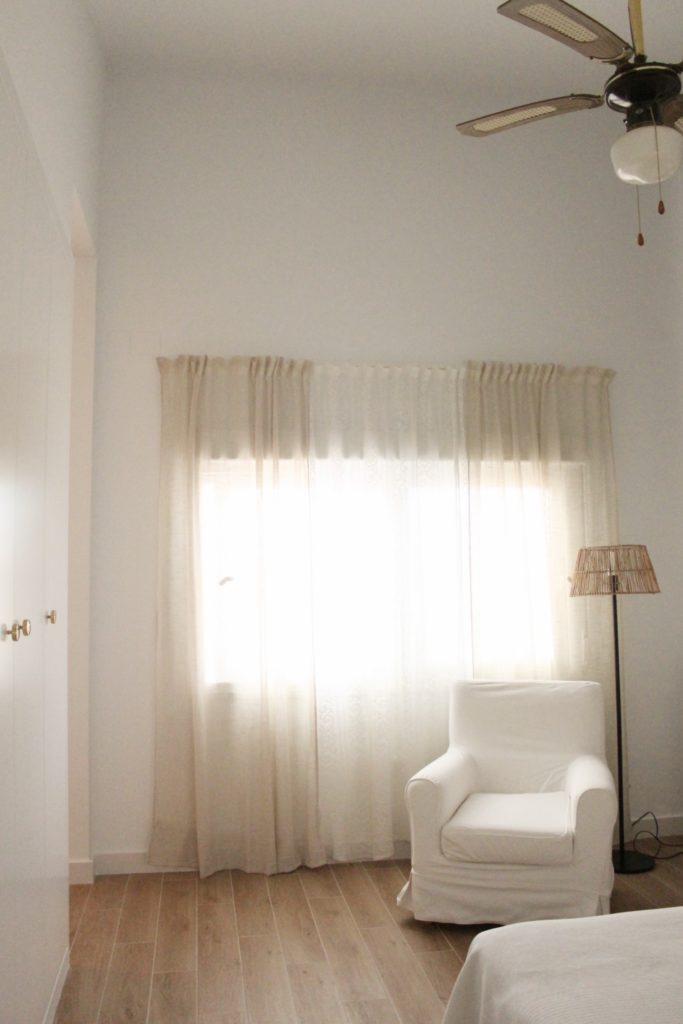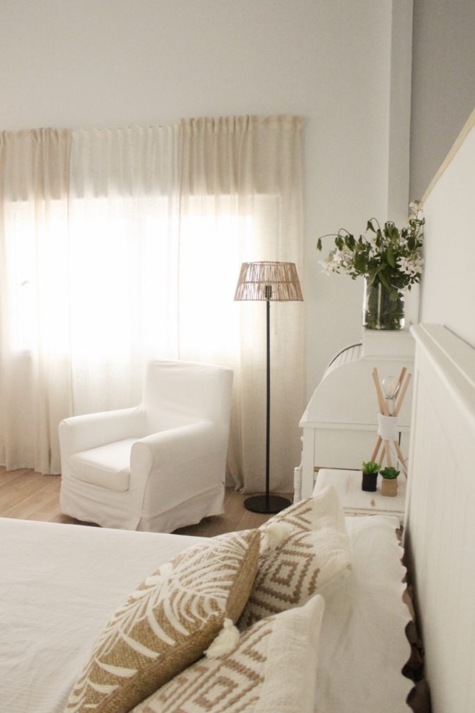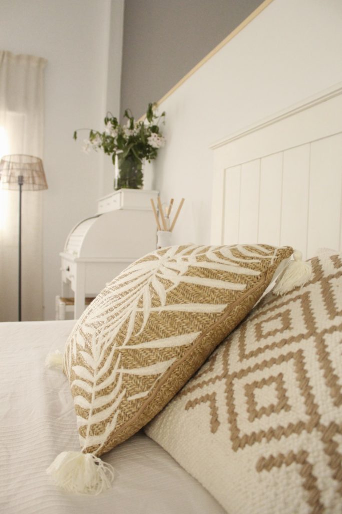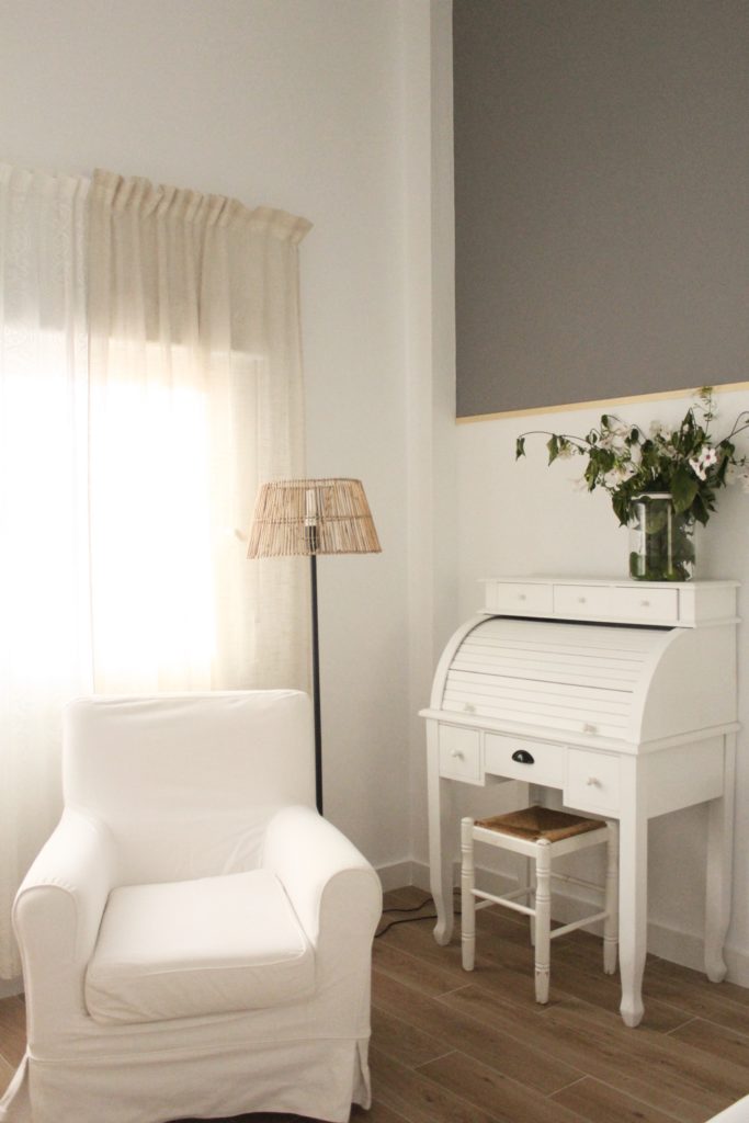 El dormitorio principal consta de un armario a medida con puertas lacadas en blanco. El cabecero se ha lacado en blanco liso y las mesitas se han lacado en blanco envejecido chalk paint. En la pared hemos pintado una franja en gris para modernizar el entorno. Las Cortinas de Lino y colcha de algodón se ha combinado con cojines de texturas naturales de Maisons du Monde .