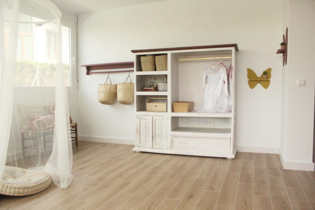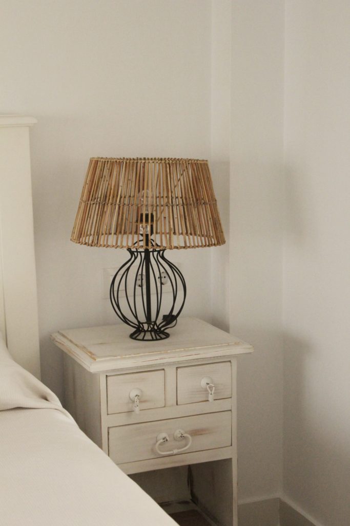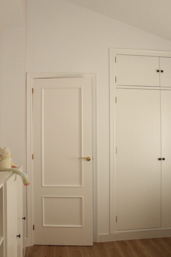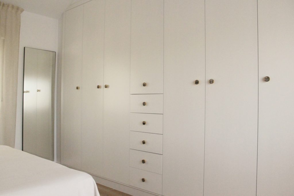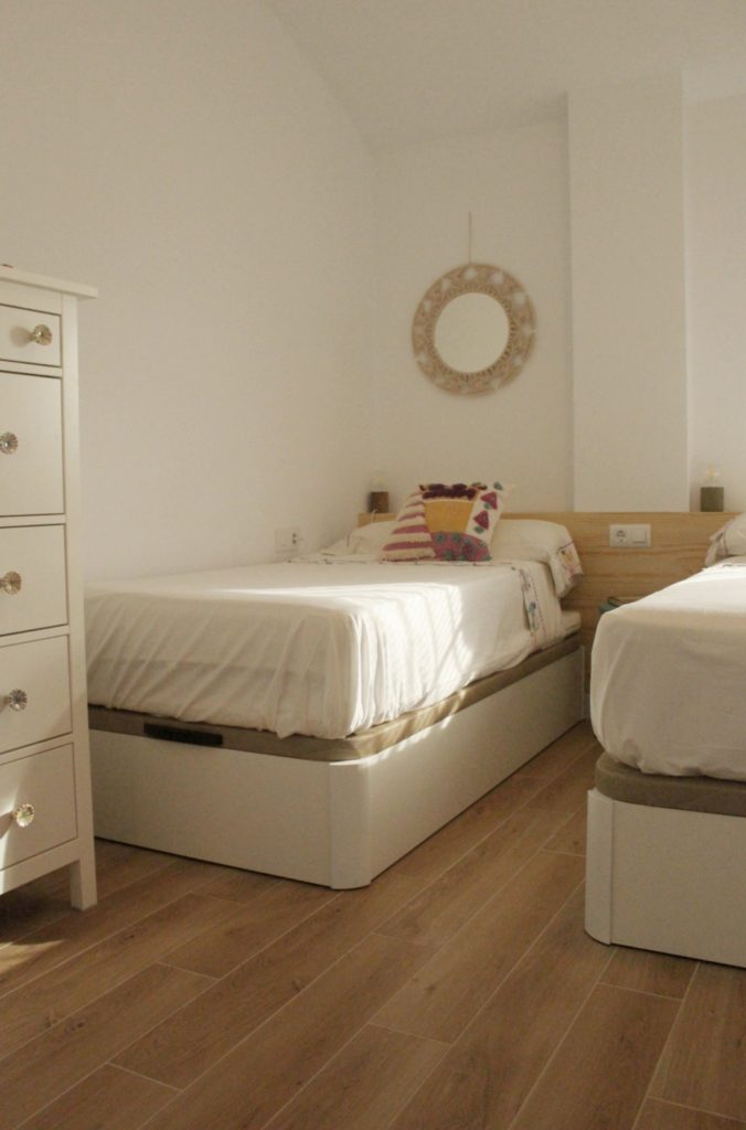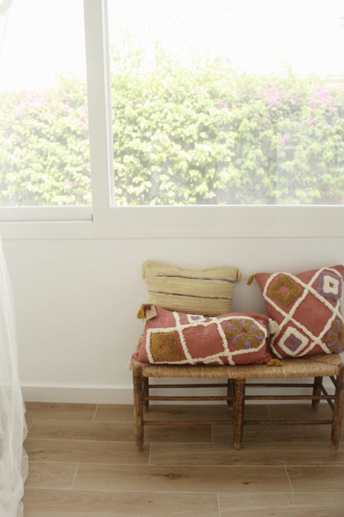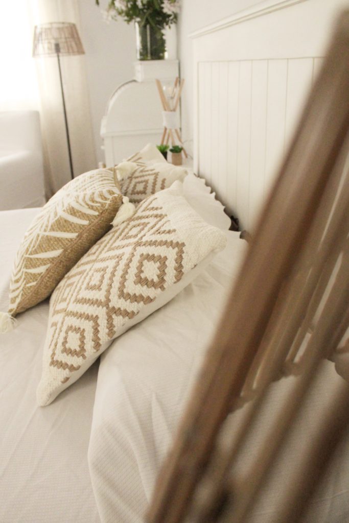 El dormitorio principal consta de un armario a medida con puertas lacadas en blanco. El cabecero se ha lacado en blanco liso y las mesitas se han lacado en blanco envejecido chalk paint. En la pared hemos pintado una franja en gris para modernizar el entorno. Las Cortinas de Lino y colcha de algodón se ha combinado con cojines de texturas naturales de Maisons du Monde .