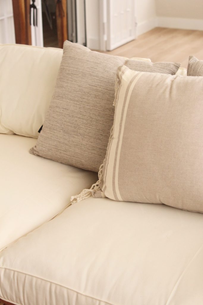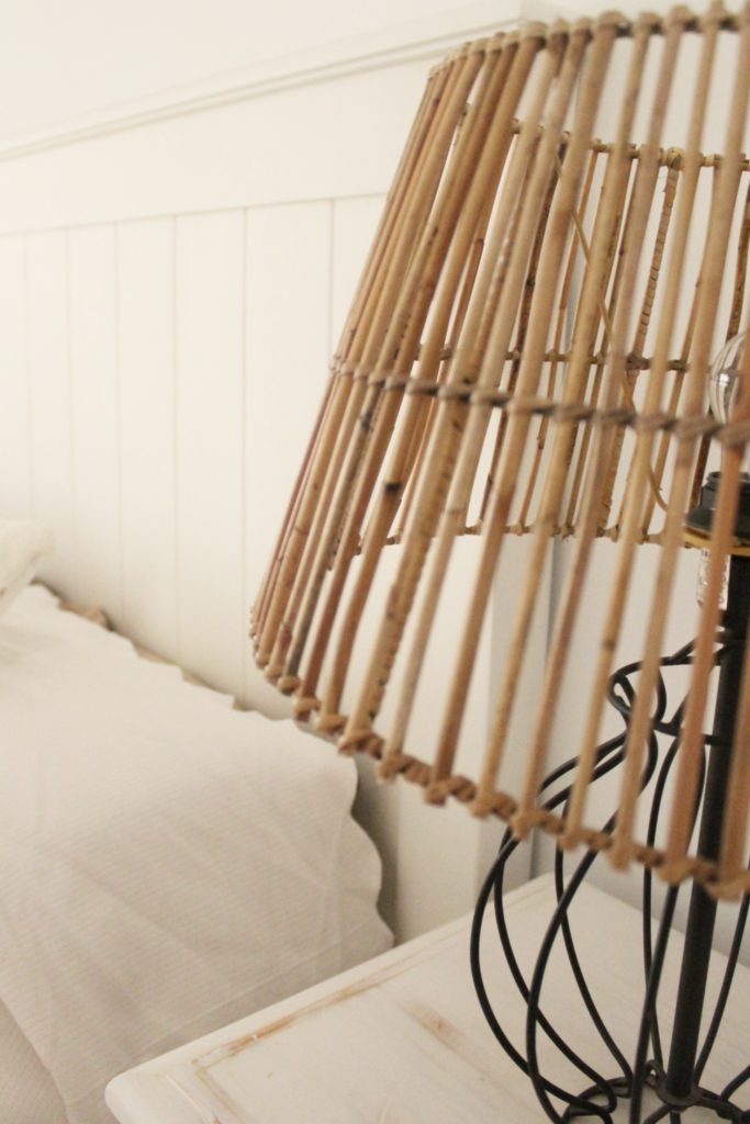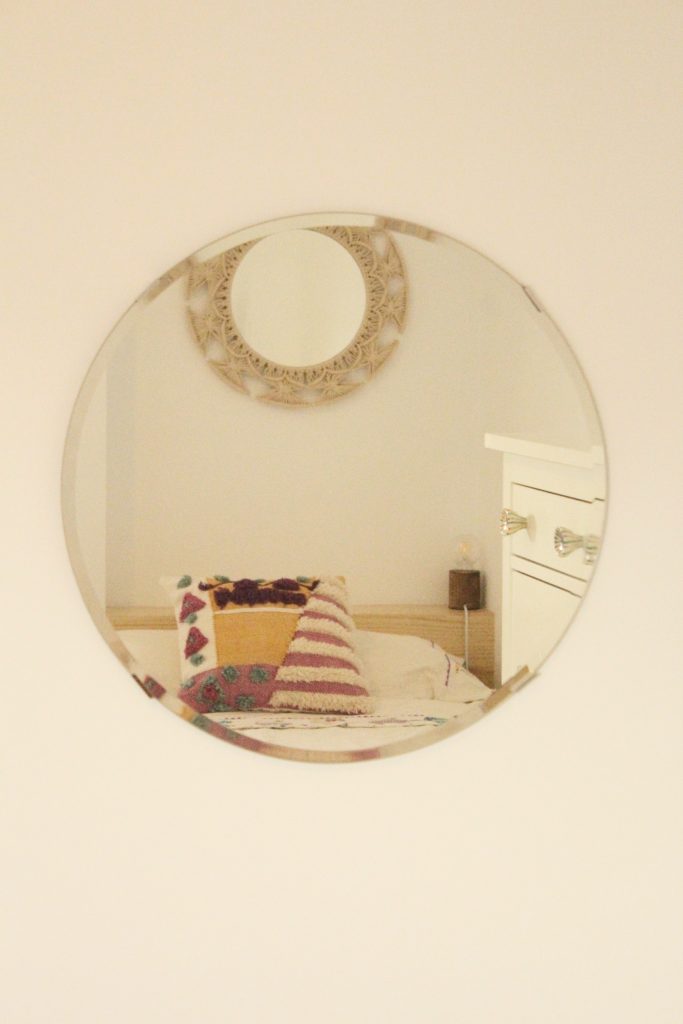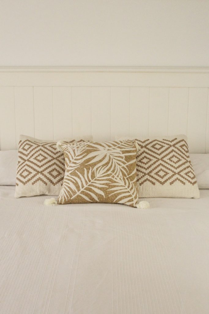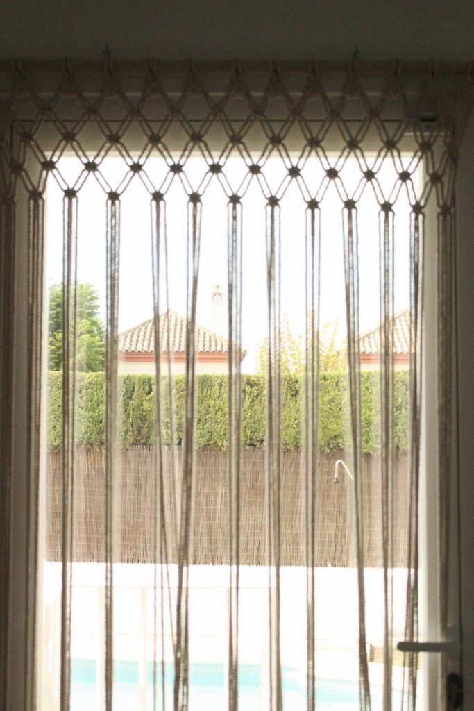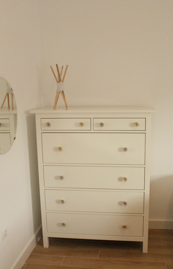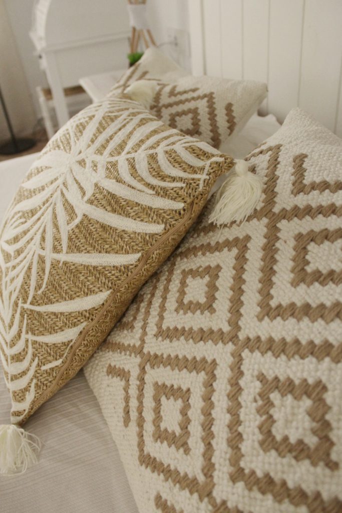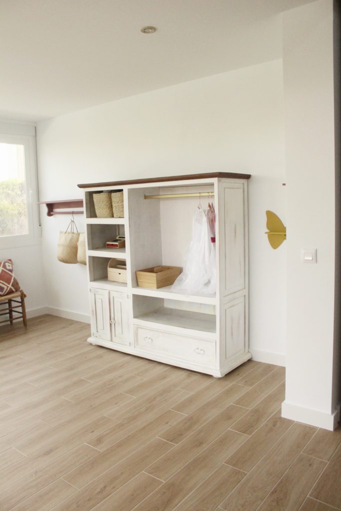 El dormitorio principal consta de un armario a medida con puertas lacadas en blanco. El cabecero se ha lacado en blanco liso y las mesitas se han lacado en blanco envejecido chalk paint. En la pared hemos pintado una franja en gris para modernizar el entorno. Las Cortinas de Lino y colcha de algodón se ha combinado con cojines de texturas naturales de Maisons du Monde .