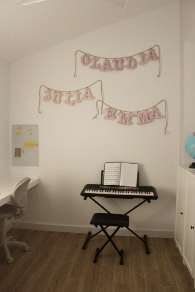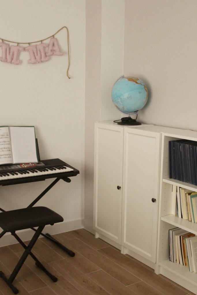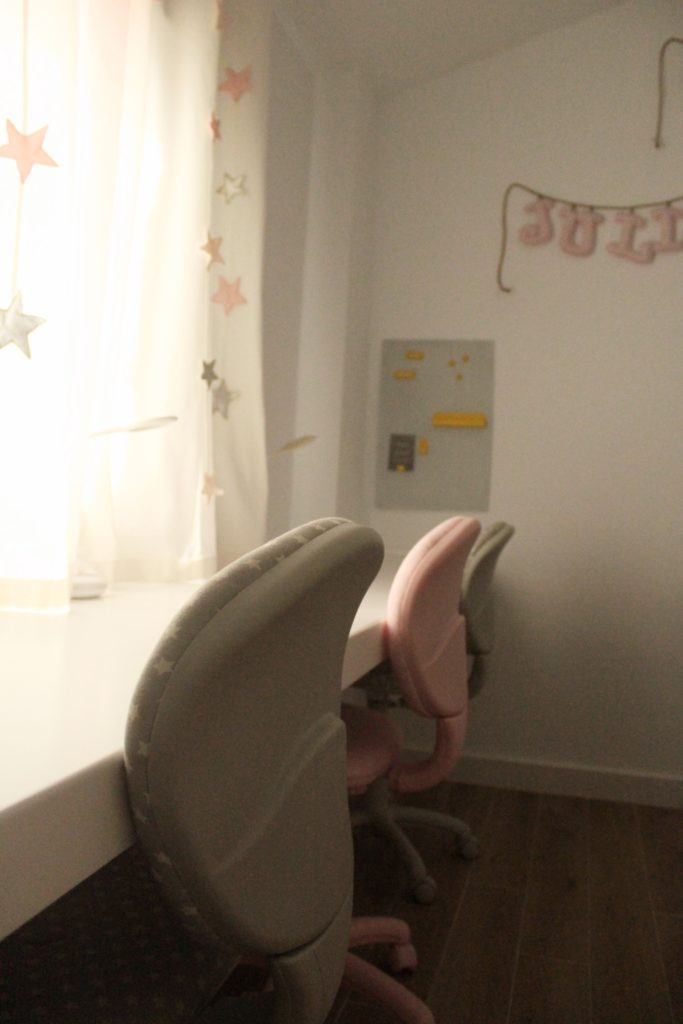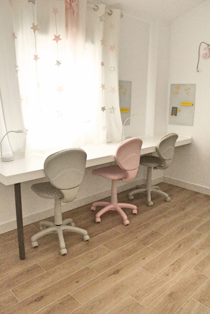En este cuarto de estudios se ha optado por colores pastel y una pared combinada en gris claro y blanco.