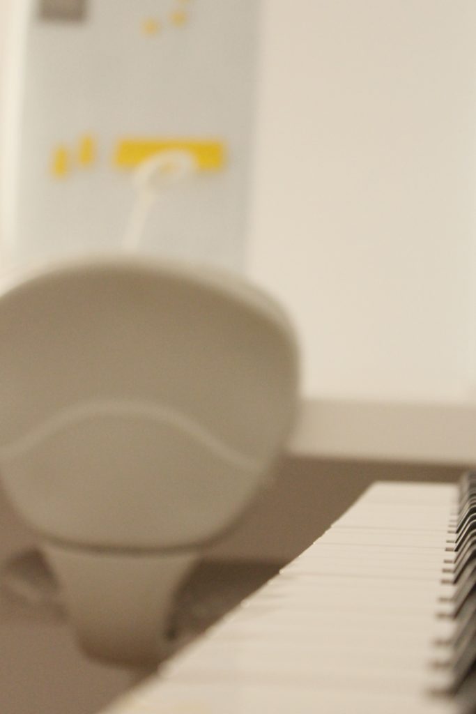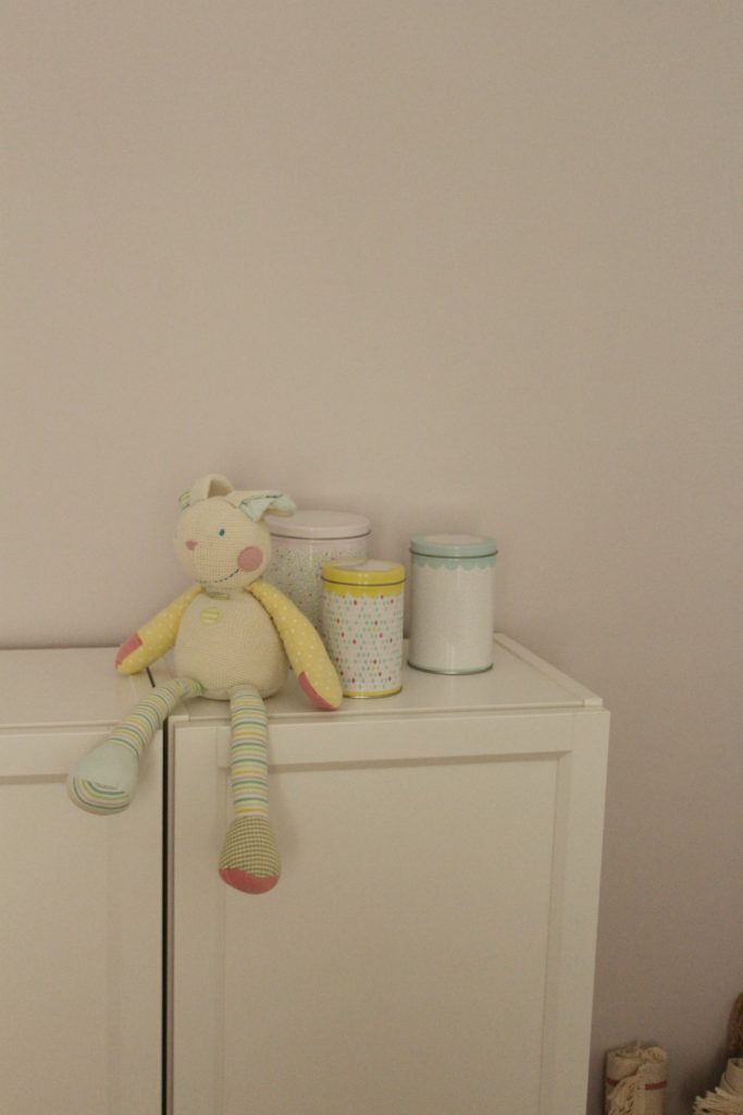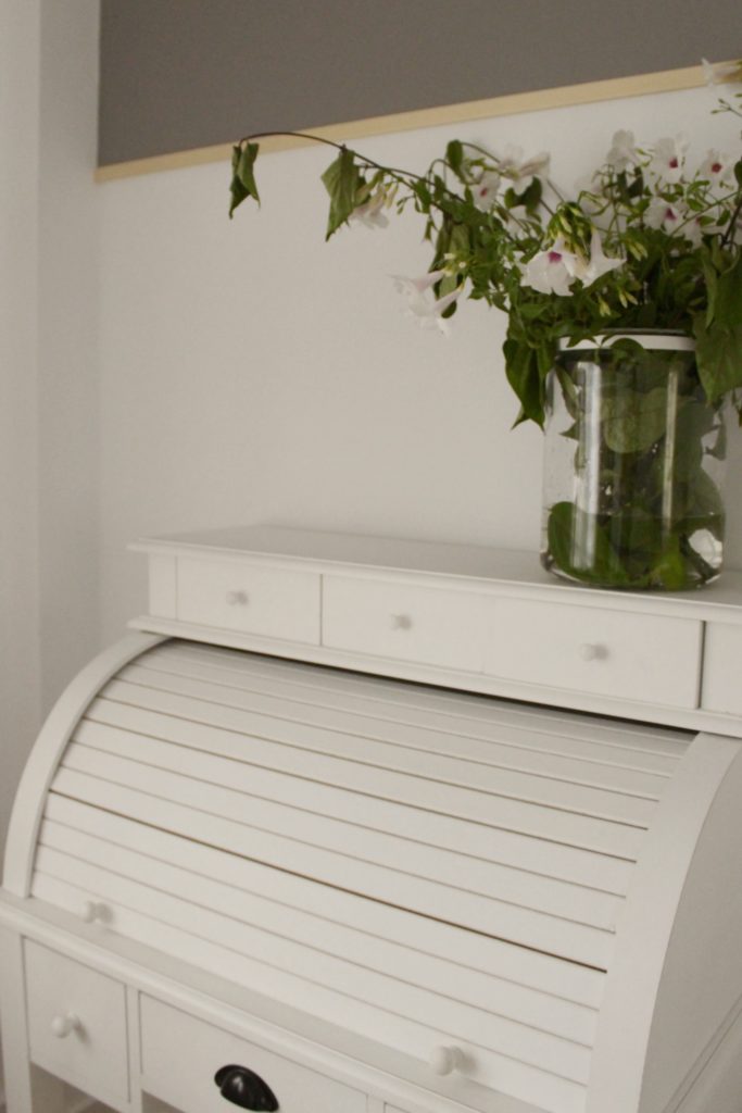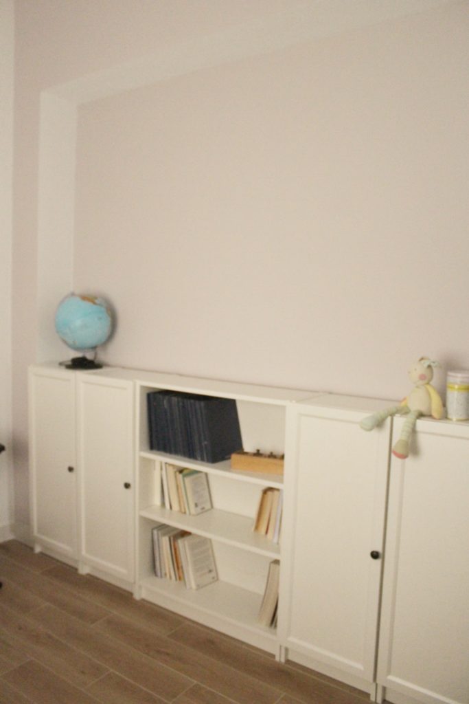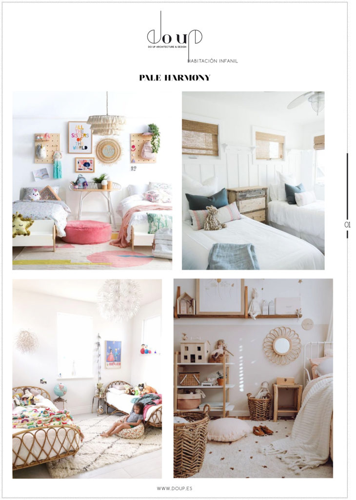En este cuarto de estudios se ha optado por colores pastel y una pared combinada en gris claro y blanco.