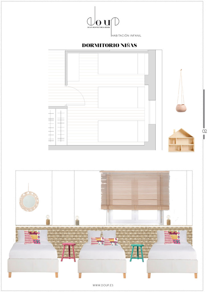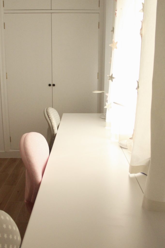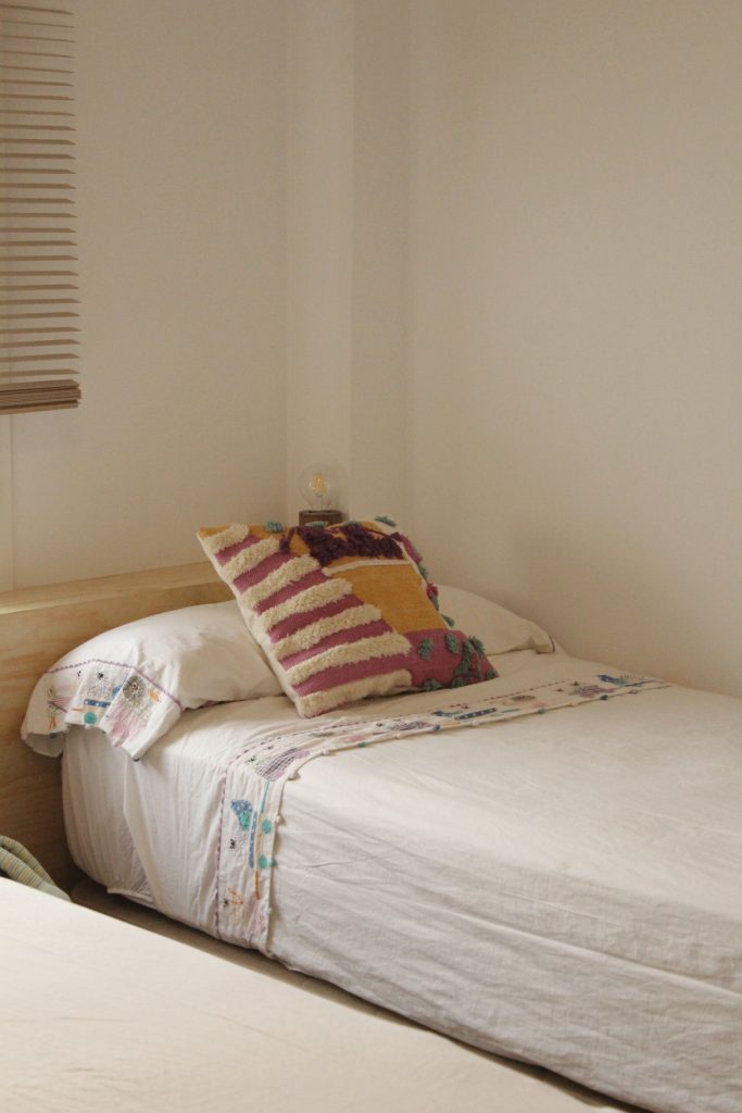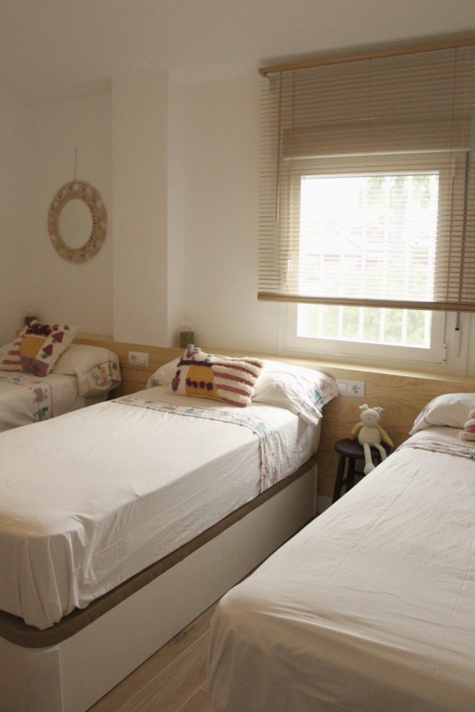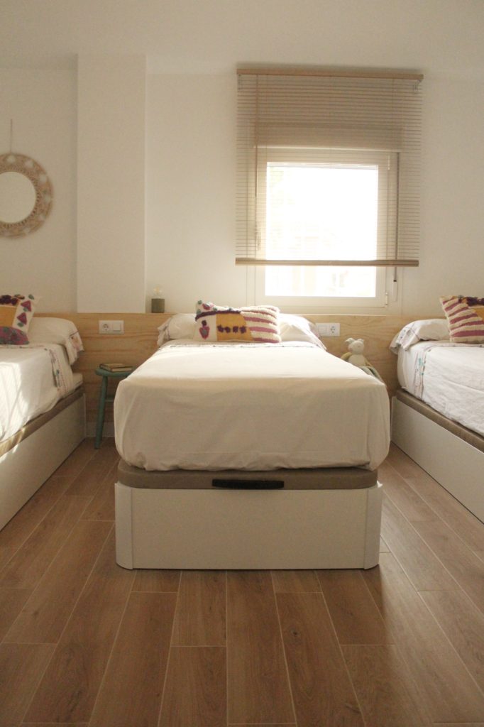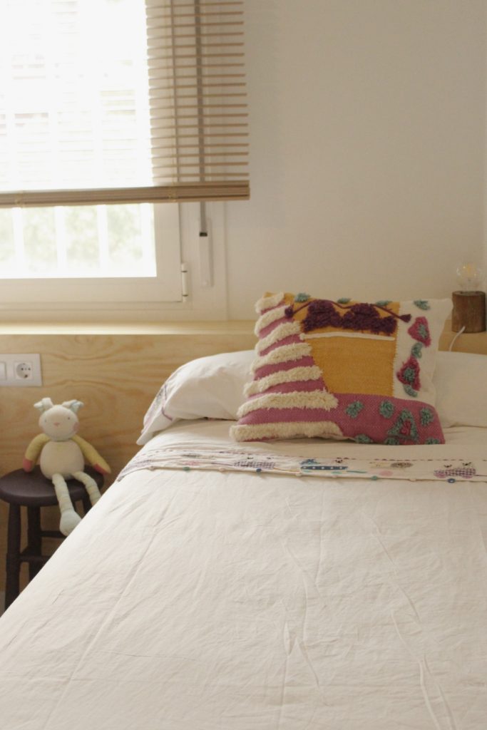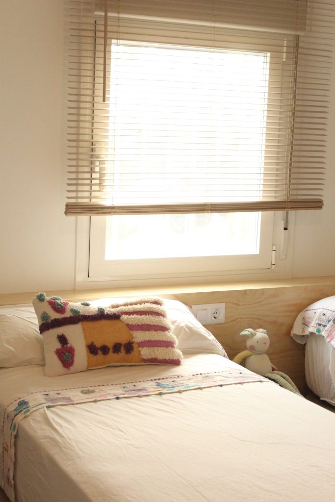 El dormitorio de las niñas incluía las tres camas ya que las peques querían dormir todas juntas. Se ha optado por un cabecero a medida de madera natural que hace de mesita de noche para poder apoyar la lámpara o cuento. La gama de color en la línea de los cojines con texturas. En estos colores y con pintura acabado tiza hemos pintadolos banquitos y la estantería de la pared.
