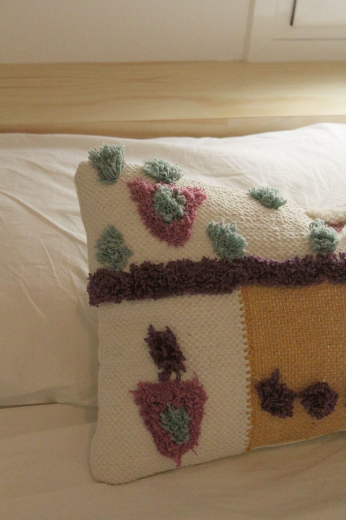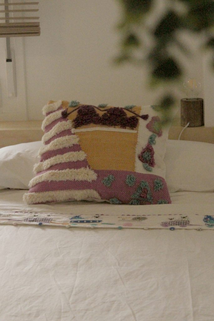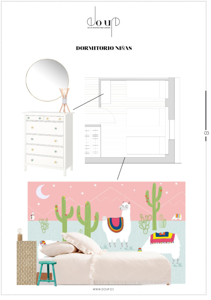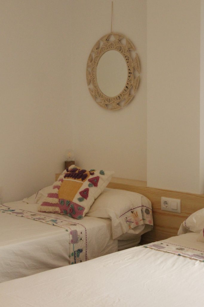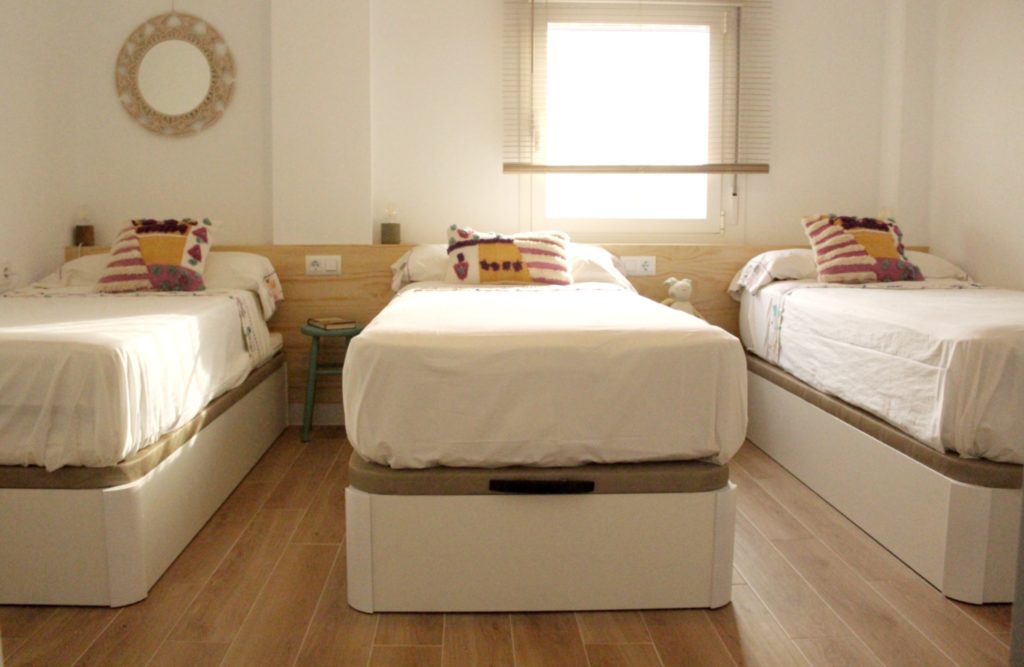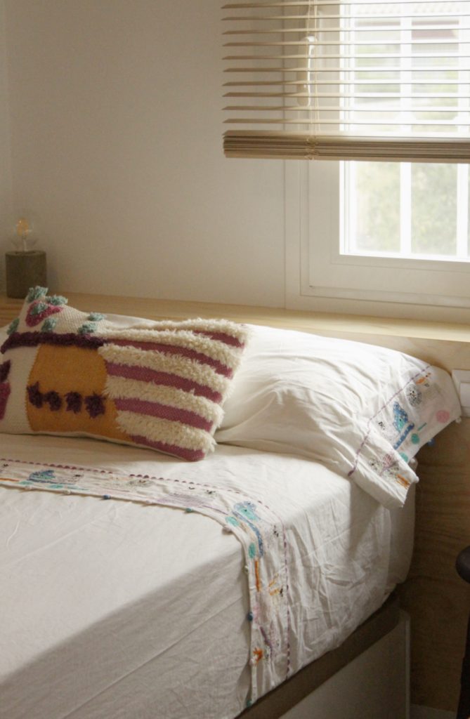 El dormitorio de las niñas incluía las tres camas ya que las peques querían dormir todas juntas. Se ha optado por un cabecero a medida de madera natural que hace de mesita de noche para poder apoyar la lámpara o cuento. La gama de color en la línea de los cojines con texturas. En estos colores y con pintura acabado tiza hemos pintadolos banquitos y la estantería de la pared.