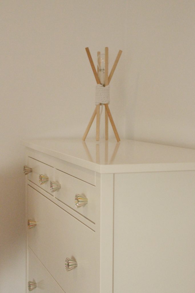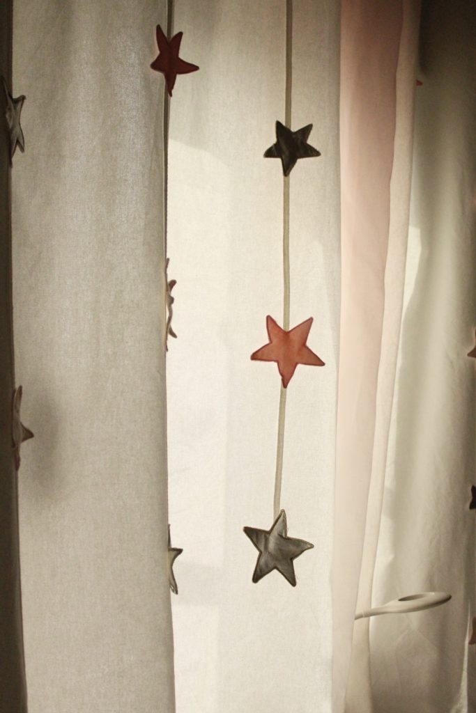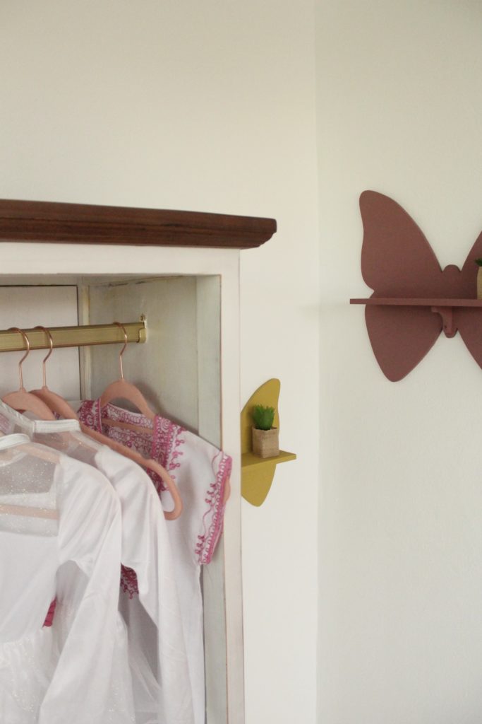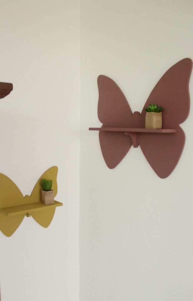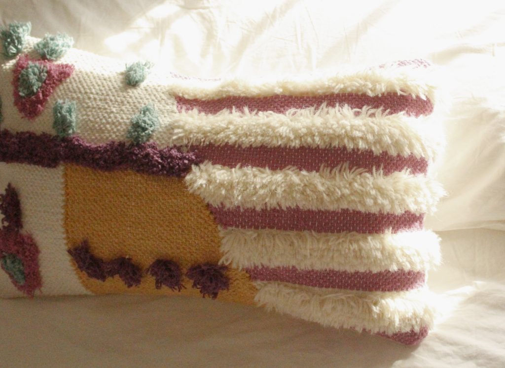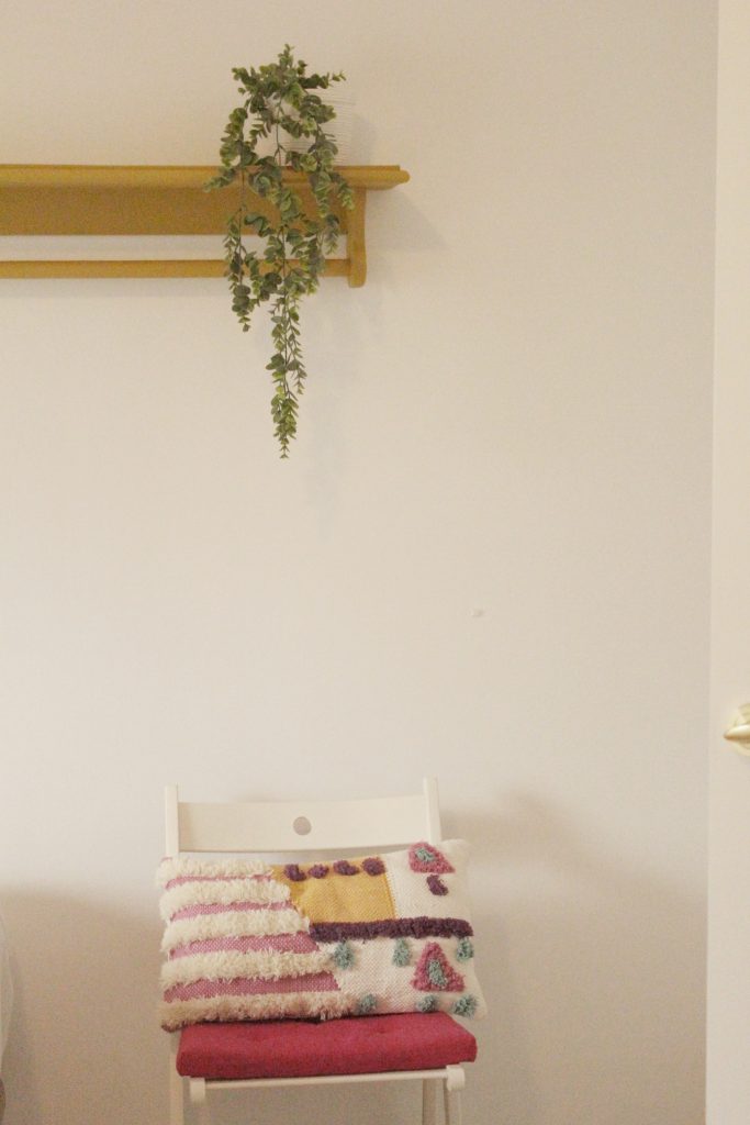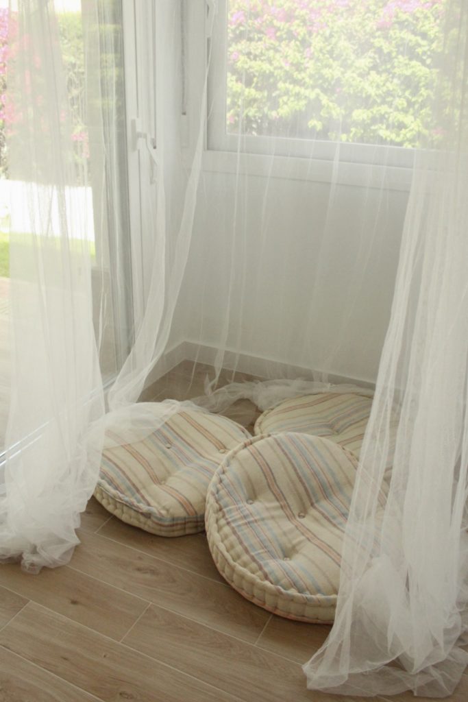 El dormitorio de las niñas incluía las tres camas ya que las peques querían dormir todas juntas. Se ha optado por un cabecero a medida de madera natural que hace de mesita de noche para poder apoyar la lámpara o cuento. La gama de color en la línea de los cojines con texturas. En estos colores y con pintura acabado tiza hemos pintadolos banquitos y la estantería de la pared.