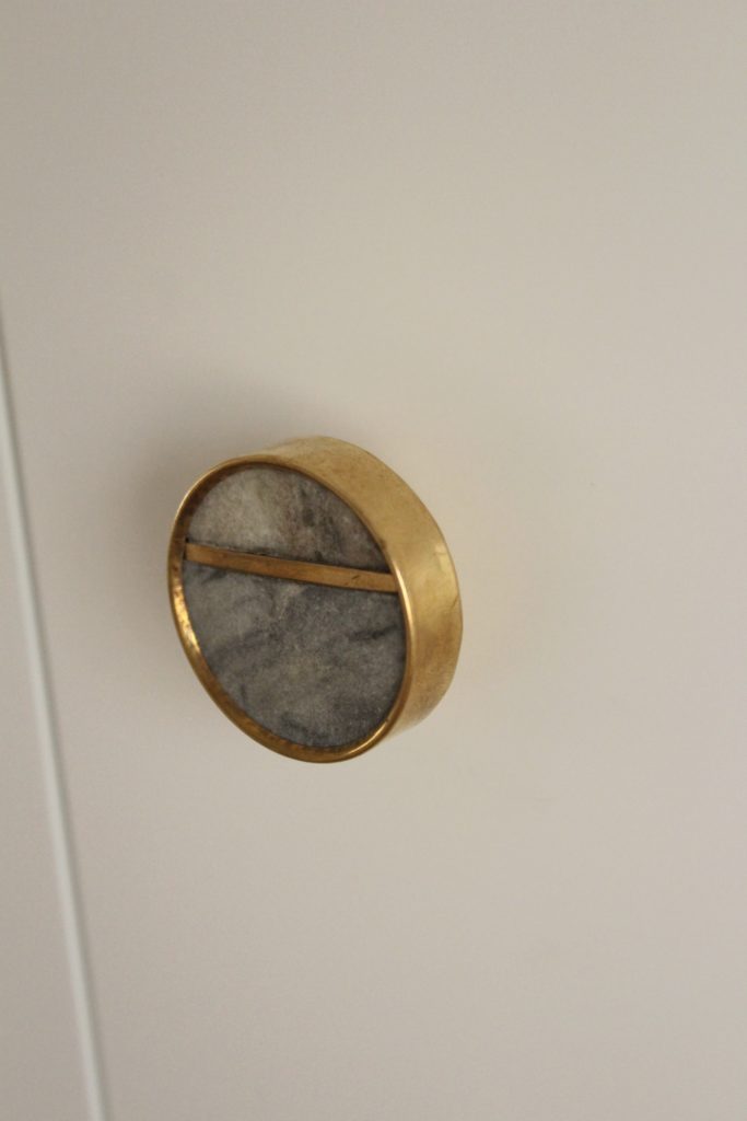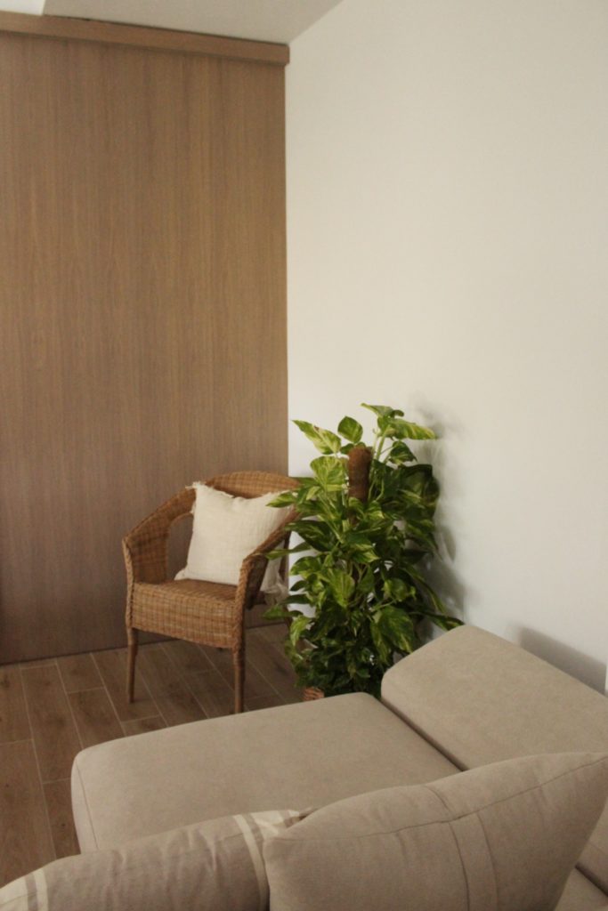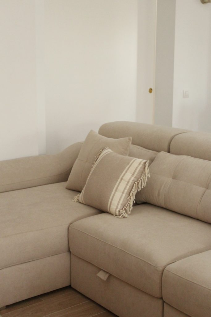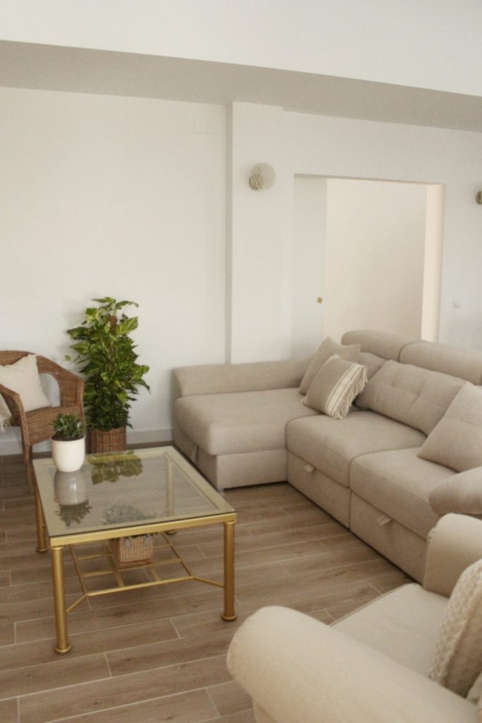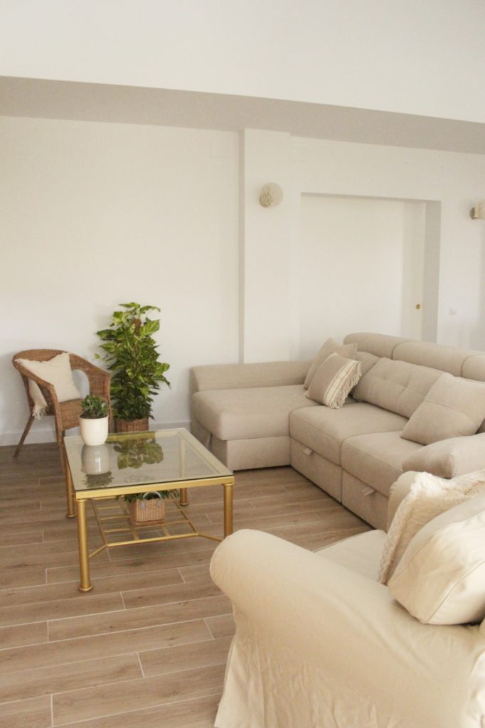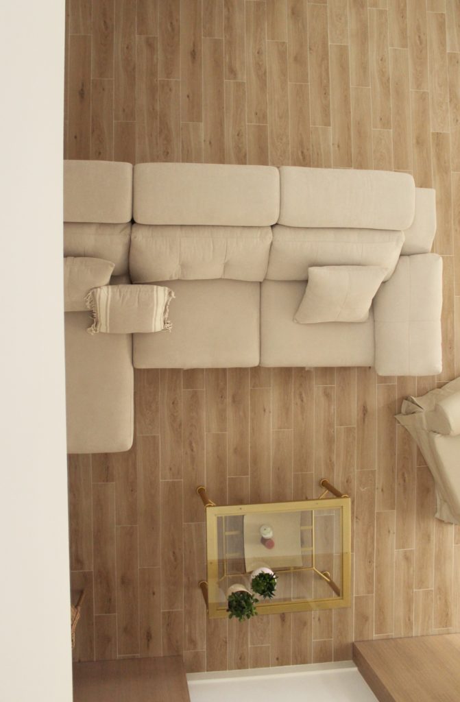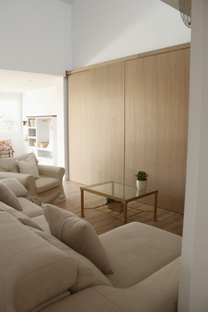 La zona de la televisión consta de un frente de madera espectacular por su dimensión y acabado que esconde dos puertas correderas, una de ellas da acceso a la zona de trabajo e invitados y la otra descubre la TV y todos los accesorios. En instagram a través de un vídeo podéis consultar a través de los histories como funcionan estas puertas. El sofá con chaislonge posee asientos deslizables que permiten ampliar la zona de relax. La mesa auxiliar se pintó de dorada para darle un aire más actual.