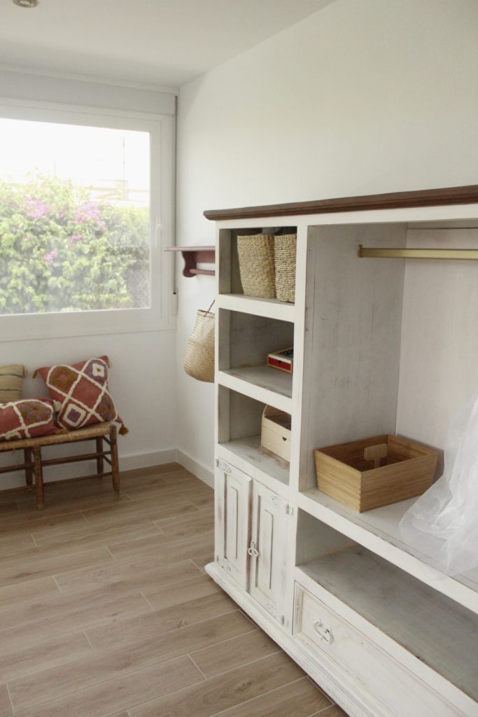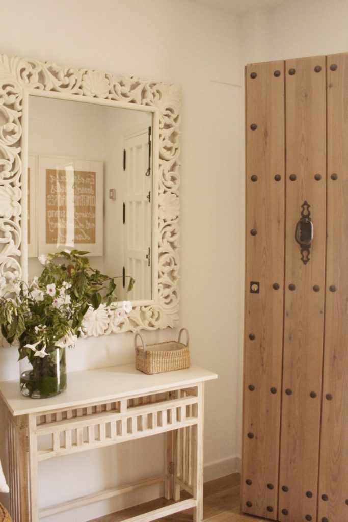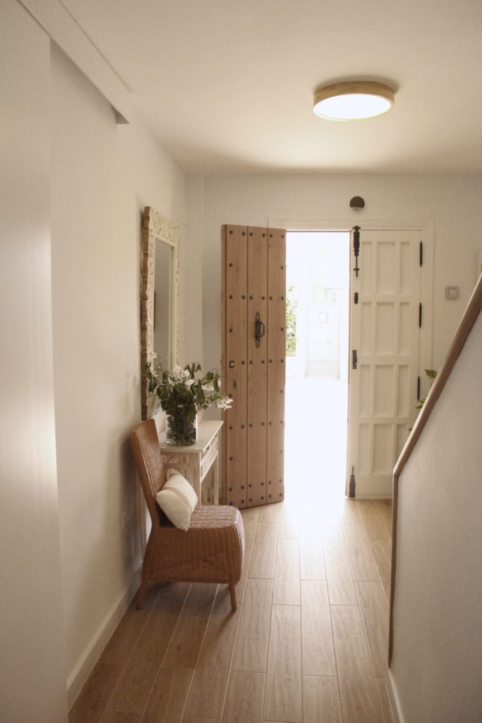 La puerta de Entrada se pintó de blanco por dentro para aportar luminosidad y por fuera se decapó y barnizó al tono de suelo. El mobiliario de estilo country acorde a los gustos de nuestro cliente. Éste gran cuadro que veis en la entrada es una idea de doup para esconder los cuadros eléctricos. Fue pintado a mano sobre fibra natural.