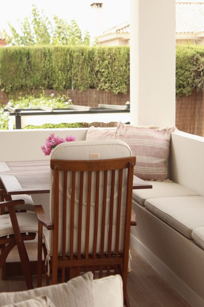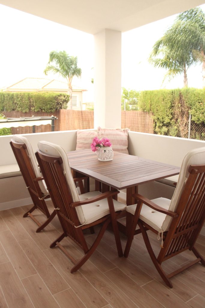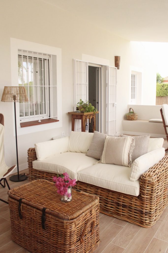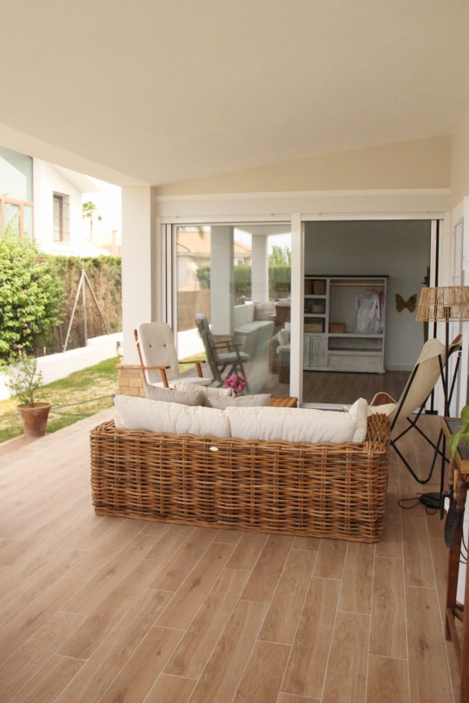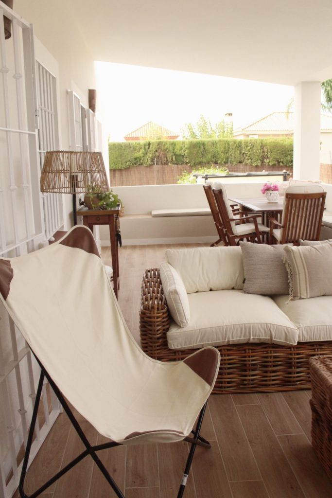 El porche consta de dos espacios diferenciados, una zona relax y una zona de comedor. Se continúa con la línea de materiales naturales y colores claros en la gama de grises, blancos y beige.