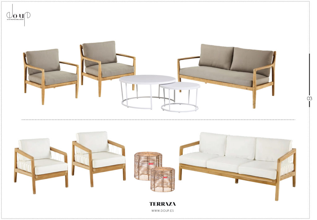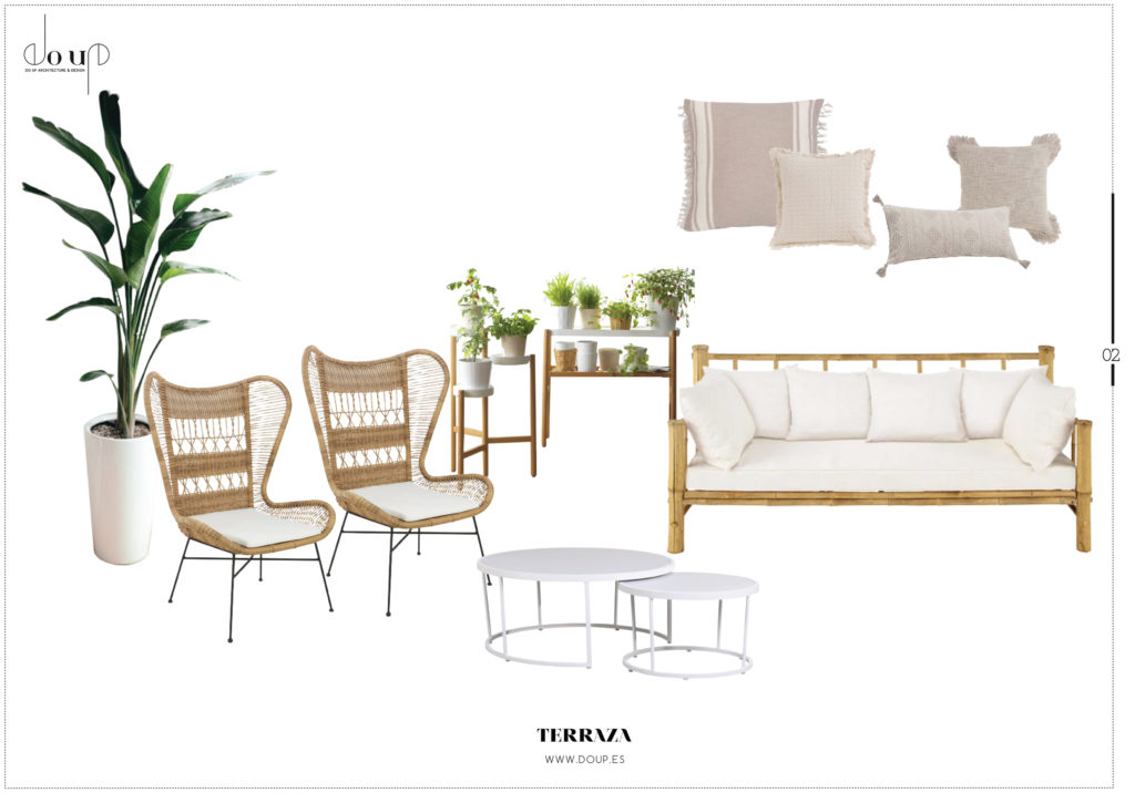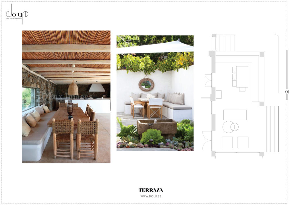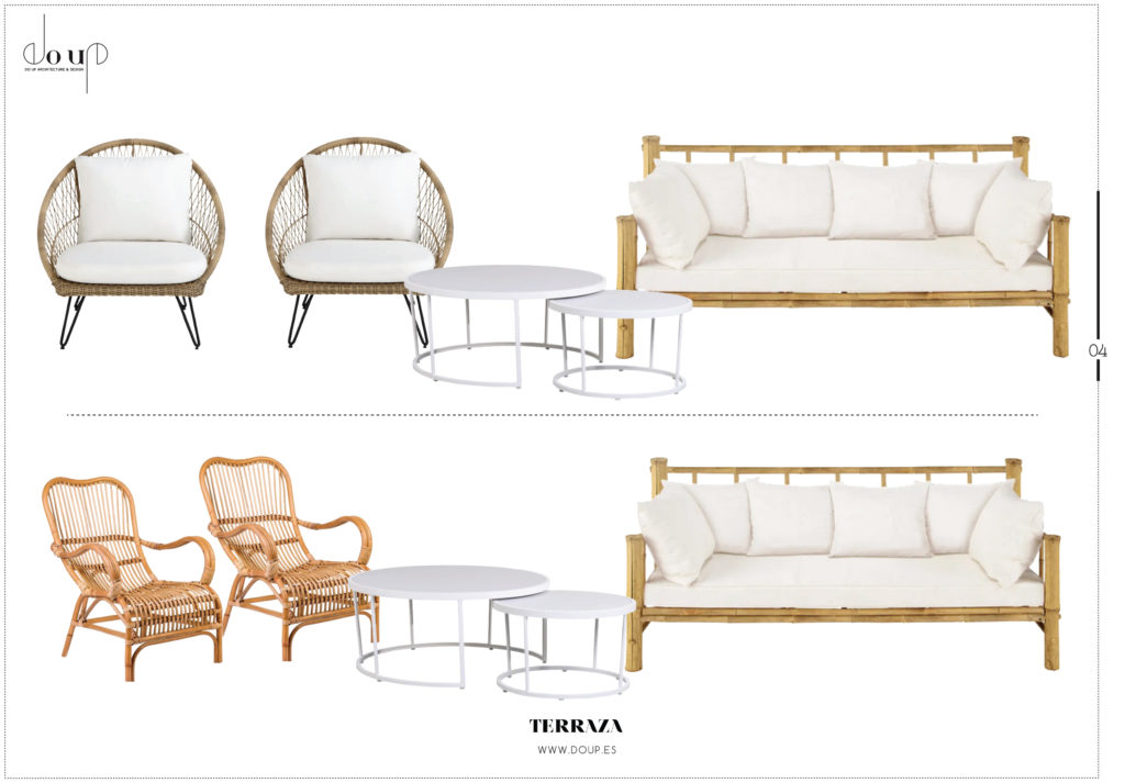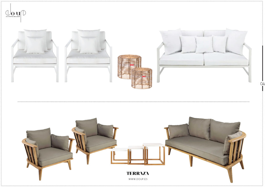 El porche consta de dos espacios diferenciados, una zona relax y una zona de comedor. Se continúa con la línea de materiales naturales y colores claros en la gama de grises, blancos y beige.