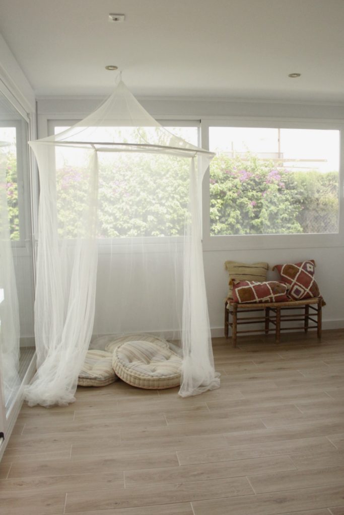 Esta zona se encuentra vinculada al salón y al porche, es un espacio ideal para jugar con mucha luz y muy versátil. Al ser una zona abierta se ha optado por muebles en la misma línea que en el salón. Las estanterías de la pared se han pintado en acabado tiza en la misma gama de los cojines.