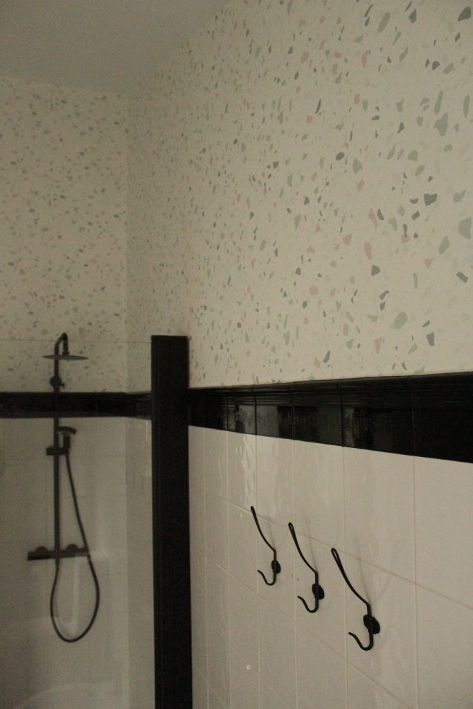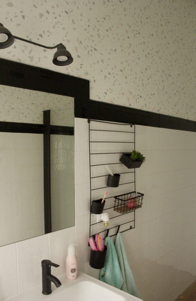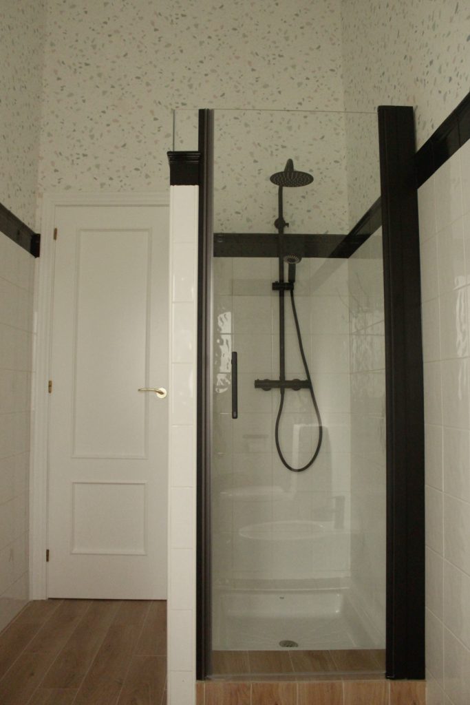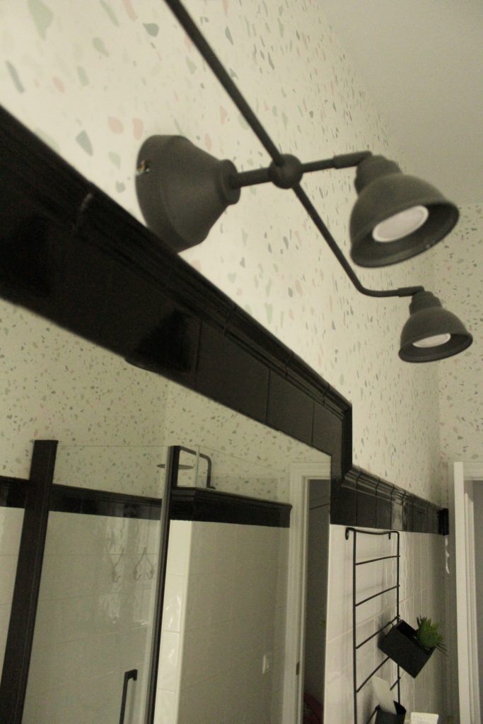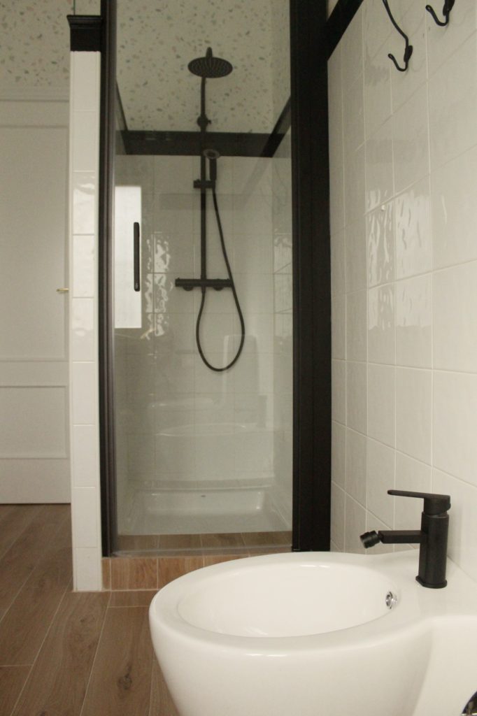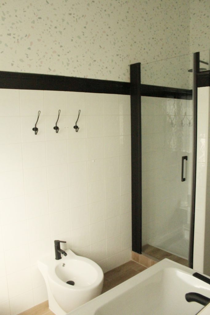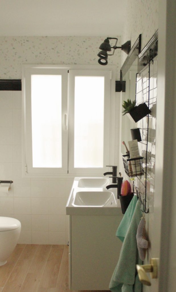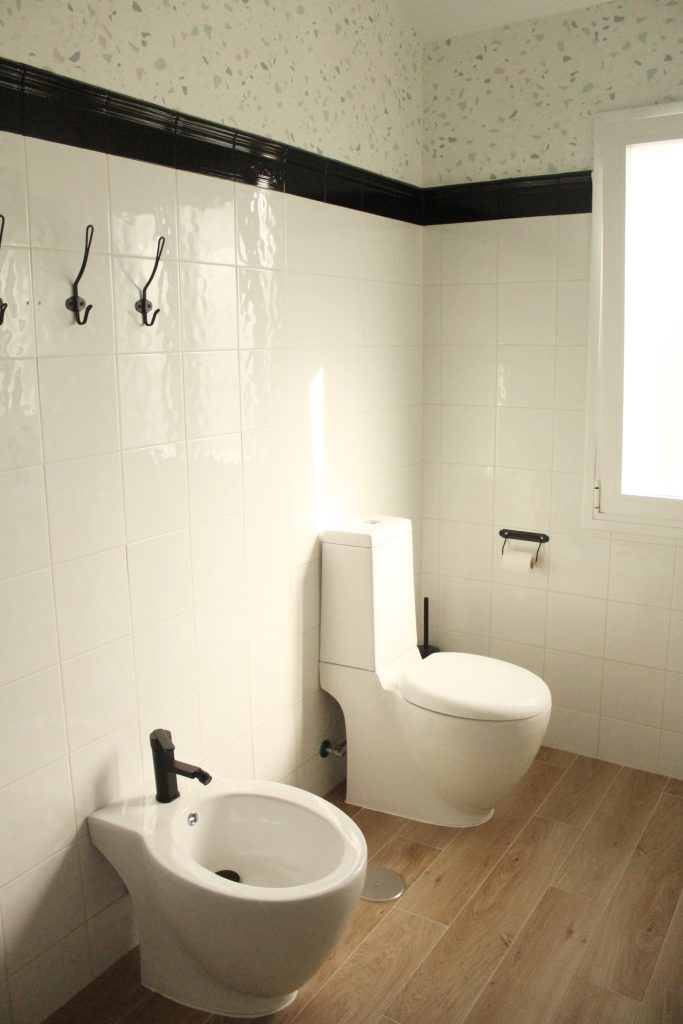 En el baño de las niñas se ha optado por un papel de print terrazo en tonos pastel, la cenefa se ha pintado en gris antracita y todos los accesorios y grifería van en color negro. El sanitario y bidé también se han puesto nuevos.
