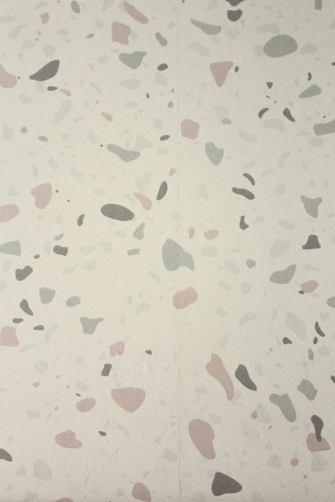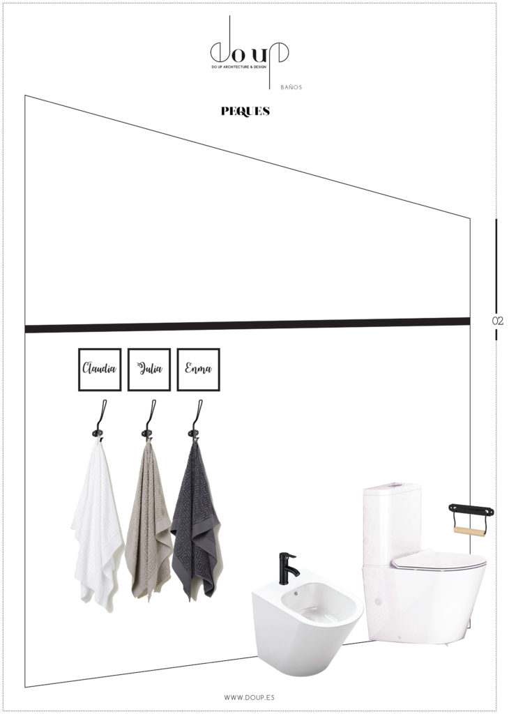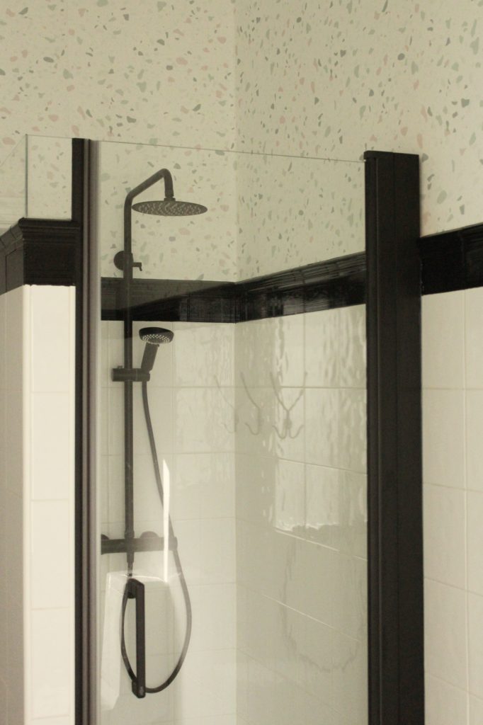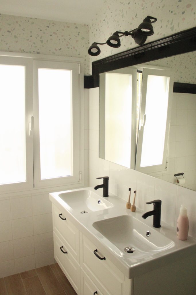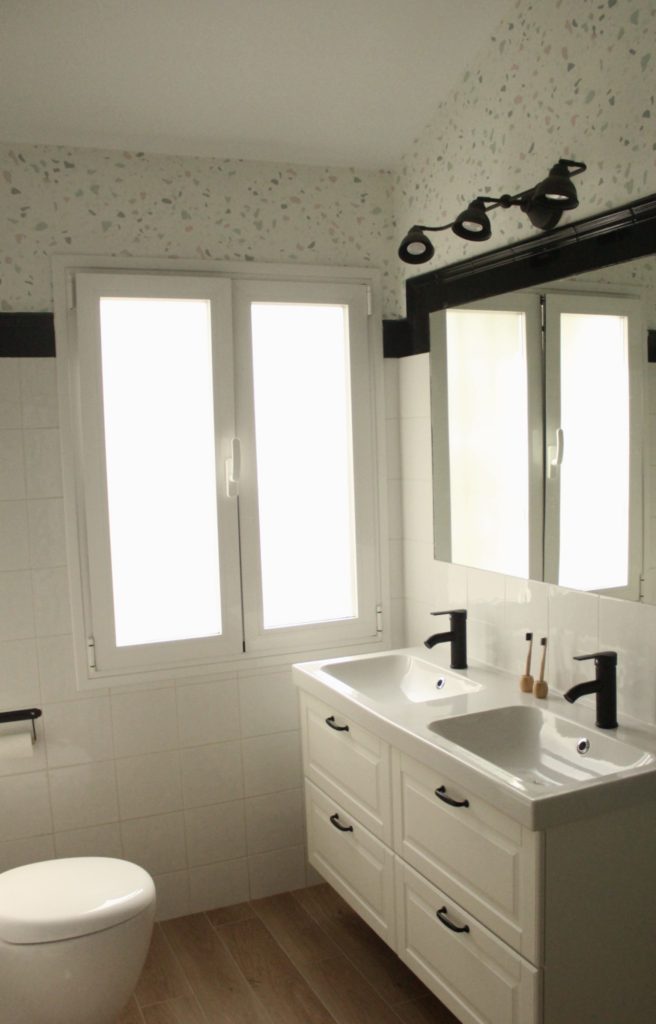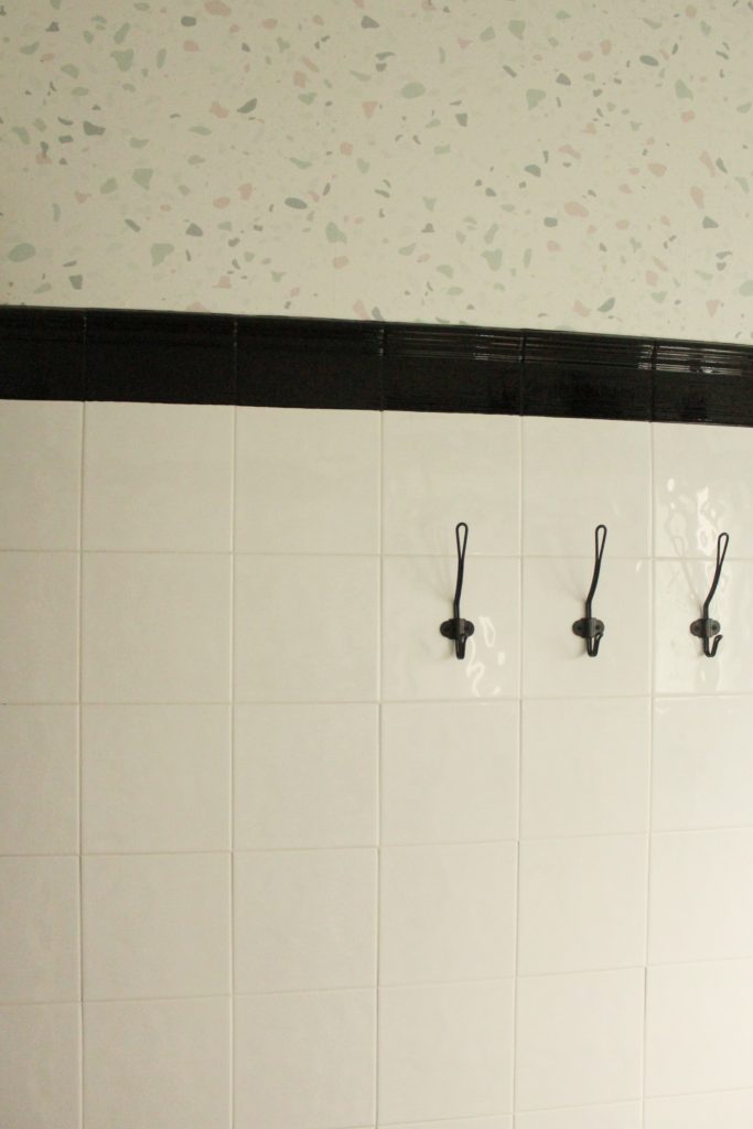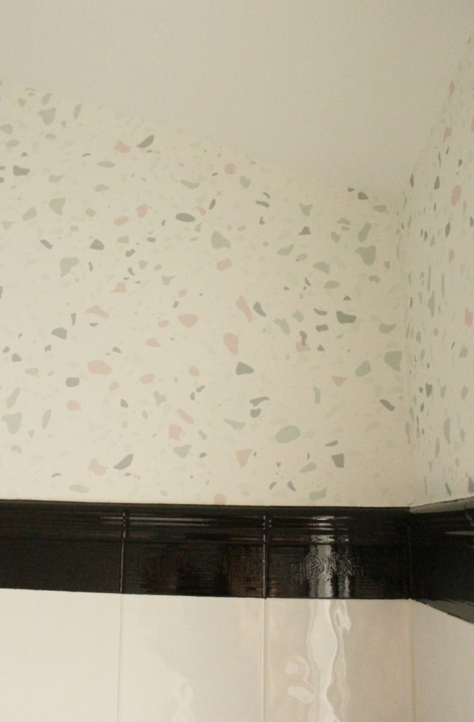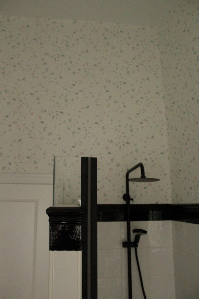 En el baño de las niñas se ha optado por un papel de print terrazo en tonos pastel, la cenefa se ha pintado en gris antracita y todos los accesorios y grifería van en color negro. El sanitario y bidé también se han puesto nuevos.