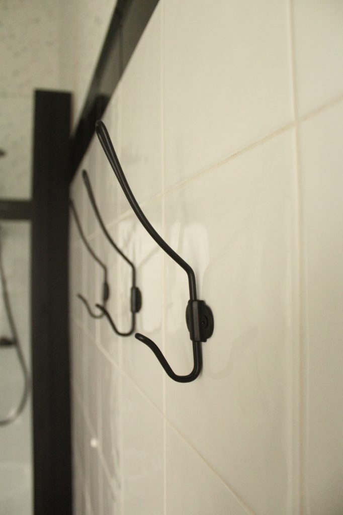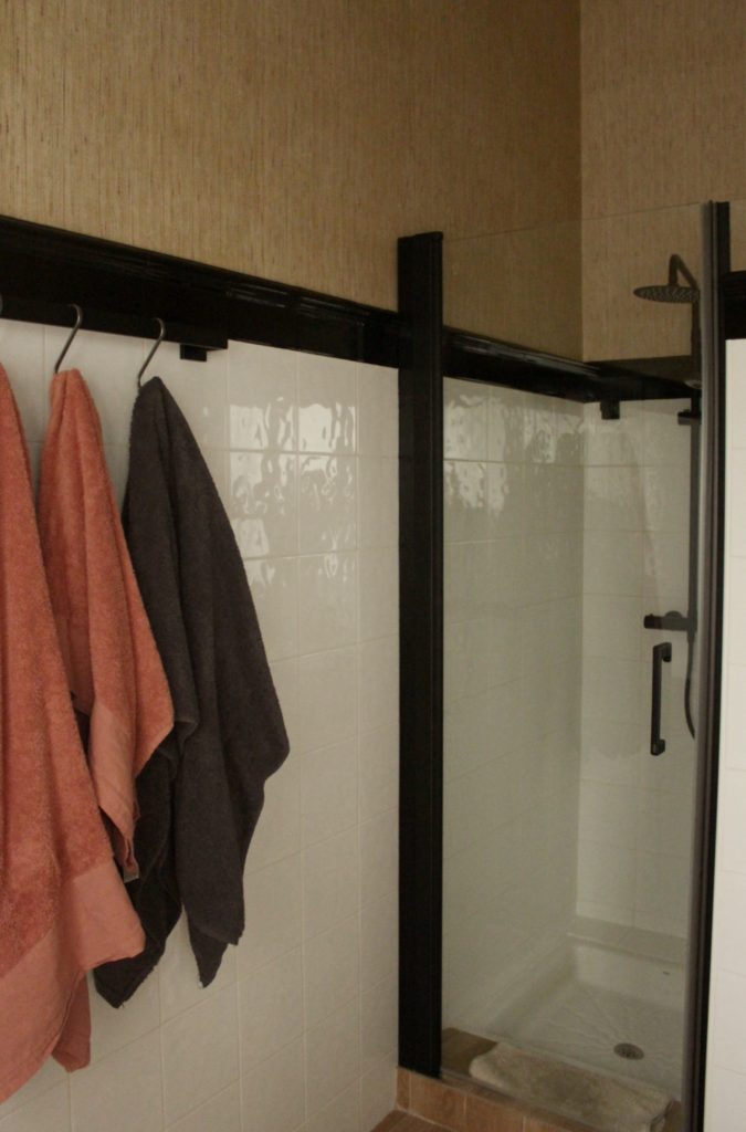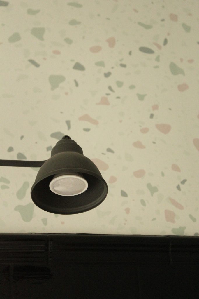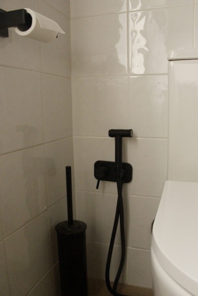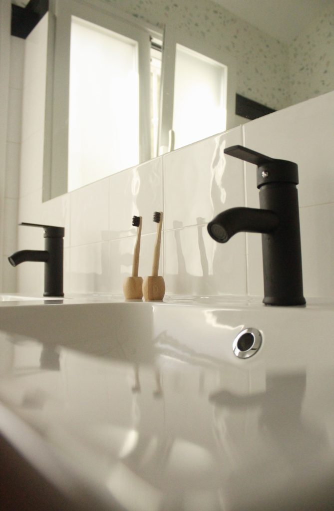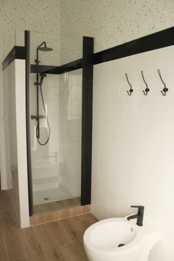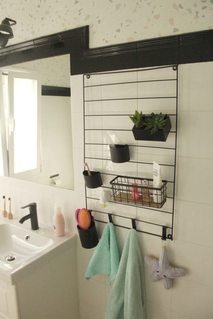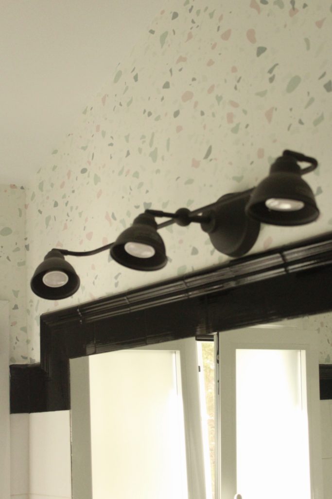 En el baño de las niñas se ha optado por un papel de print terrazo en tonos pastel, la cenefa se ha pintado en gris antracita y todos los accesorios y grifería van en color negro. El sanitario y bidé también se han puesto nuevos.