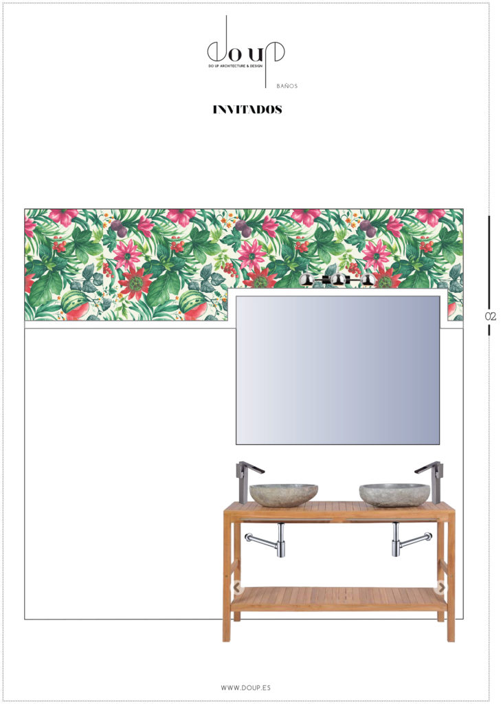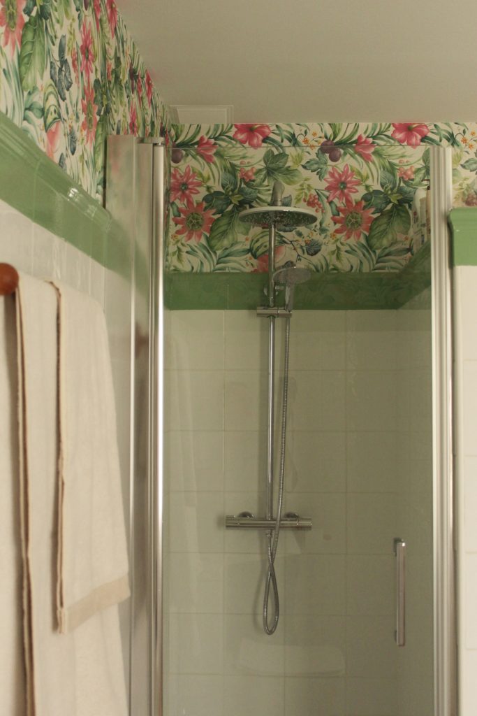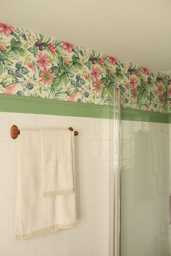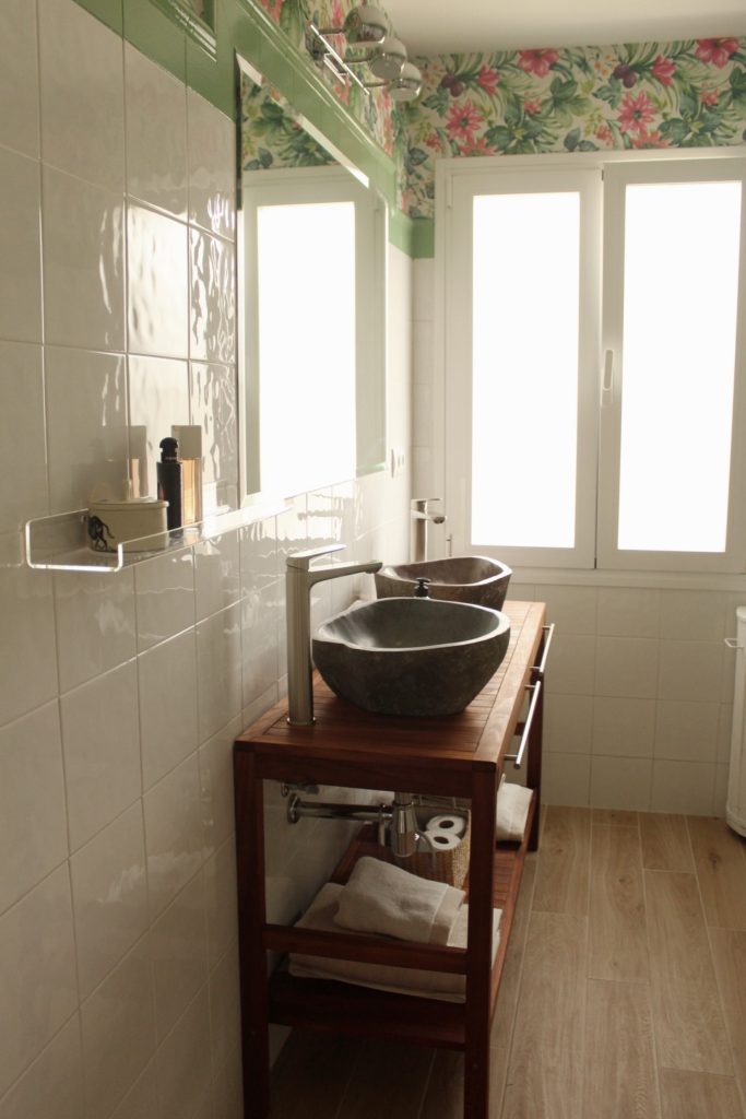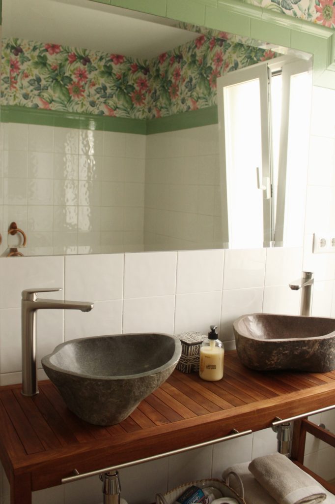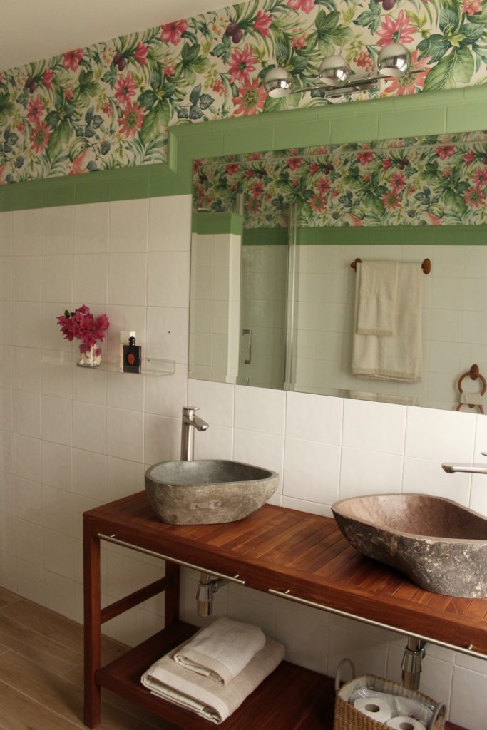 La vivienda consta de tres baños a los que únicamente se les cambió el suelo, los sanitarios y lavabos. Los azulejos antiguos se dejaron pintando la cenefa y aplicando un papel pintado en la parte superior. En este caso se ha optado por un papel de flores con un estilo muy fresco y tropical y la cenefa se ha pintado un verde menta. El mueble del lavabo de madera de teka se ha combinasdo con unos espectaculares lavabos suspendidos de piedra natural.
