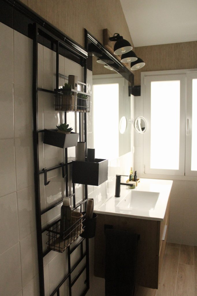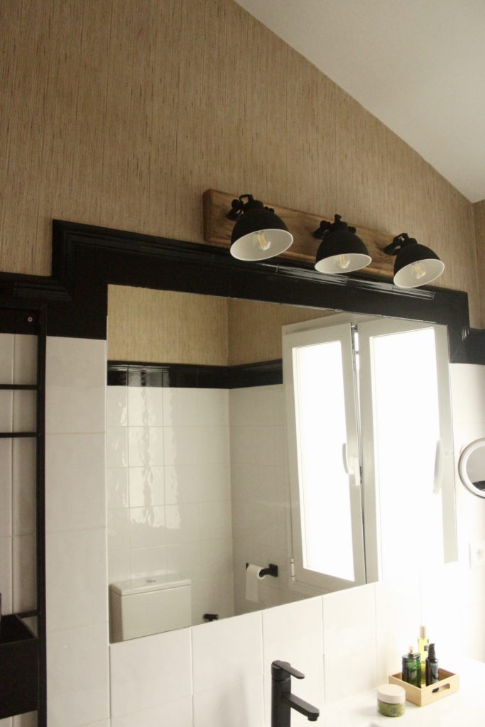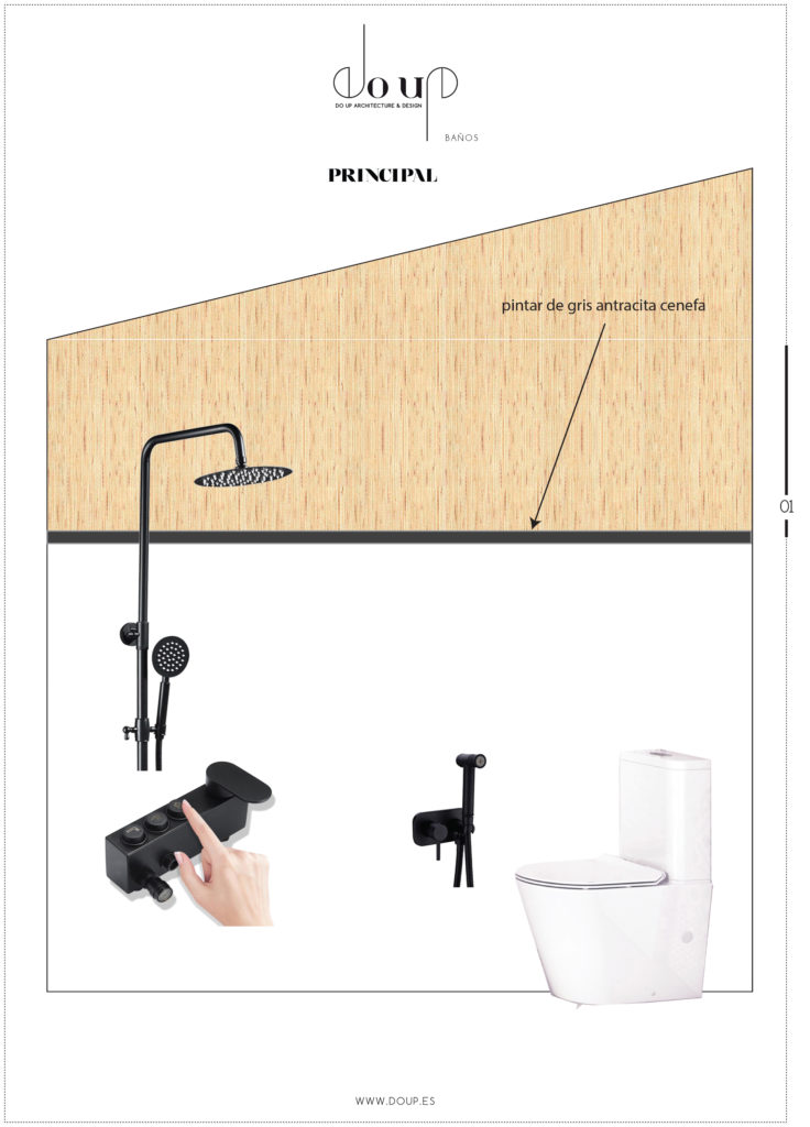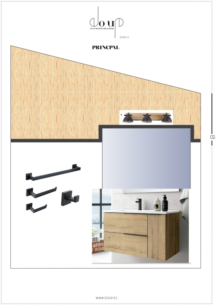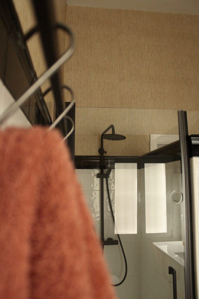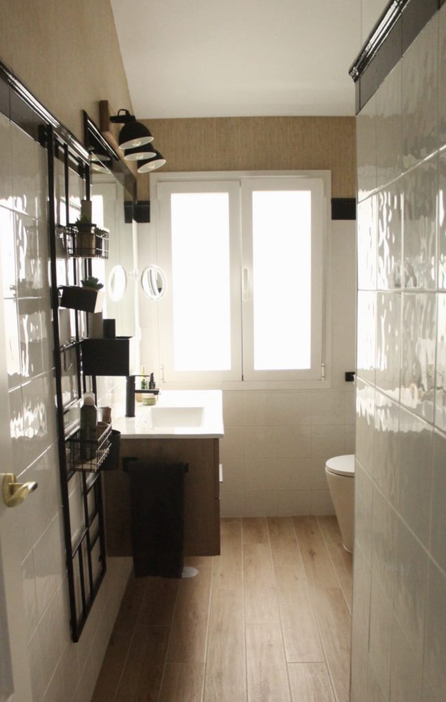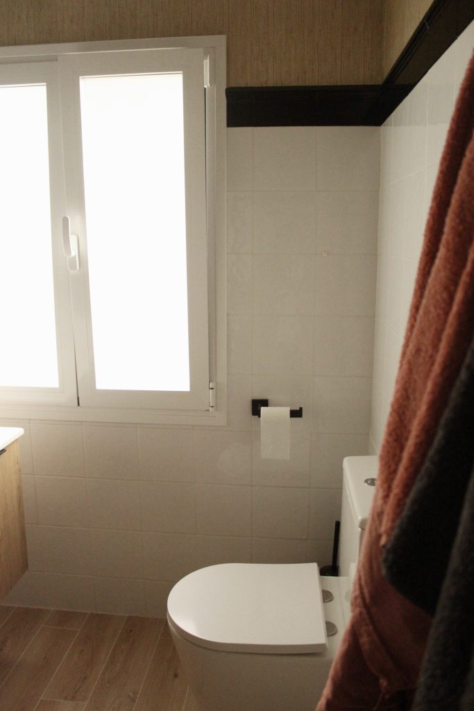 En el baño principal se ha optado por un papel pintado de fibra natural en acabado bambú, los accesorios y grifería se ha puesto de color negro y la cenefa antigua se ha pintado de gris antracita . El lavabo también es nuevo en madera y cerámica blanca. En este baño se ha cambiado el sanitario y se optado por poner un grifo bidé.