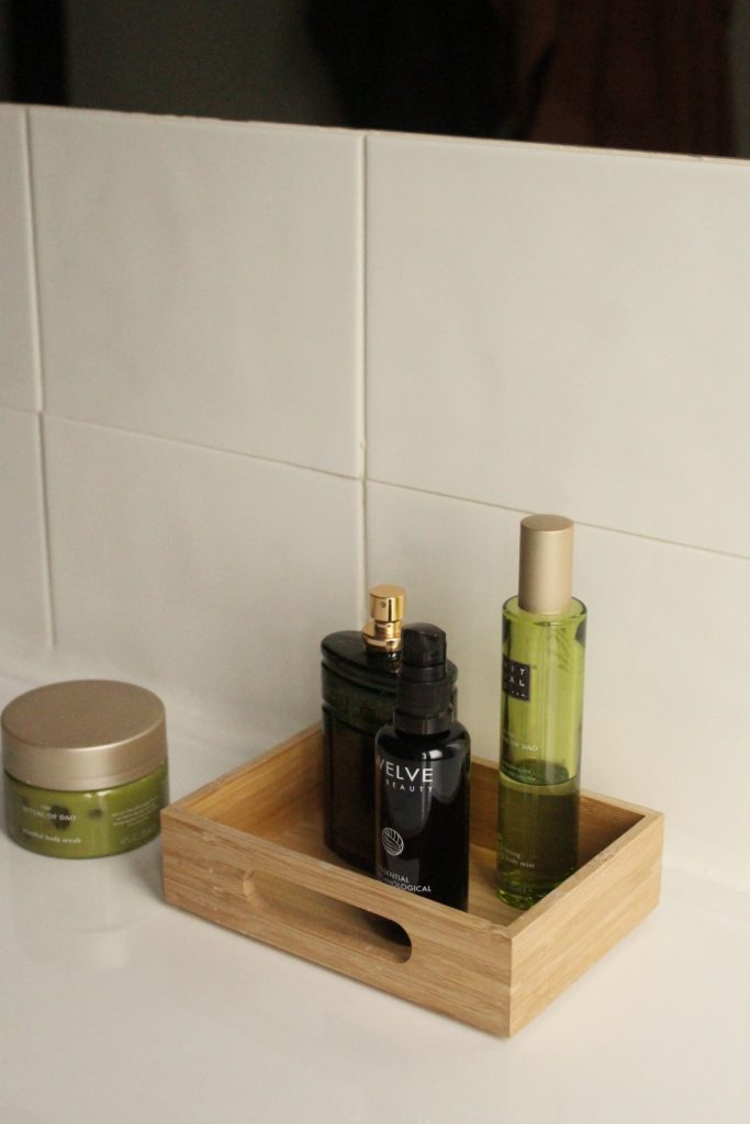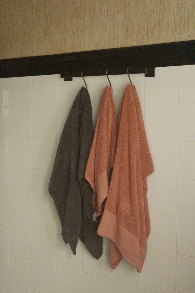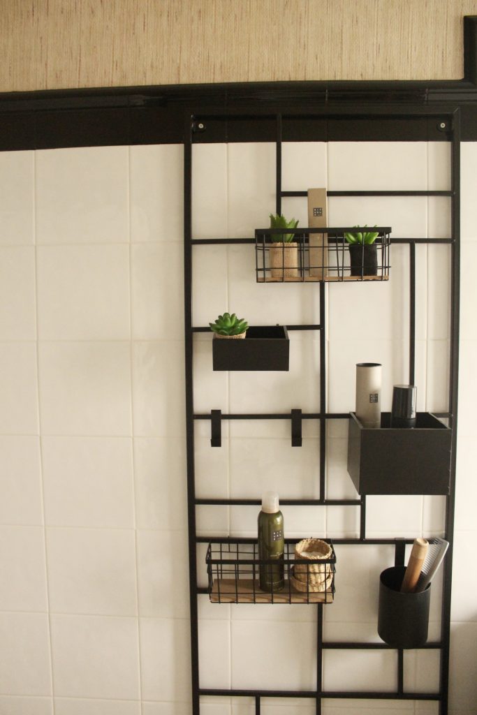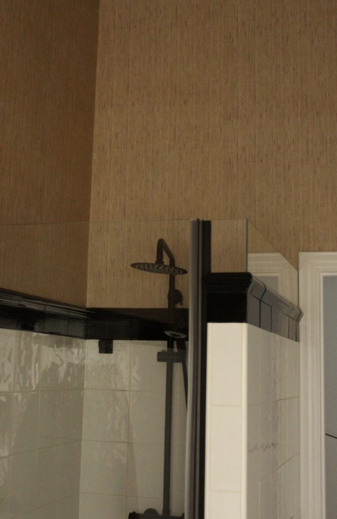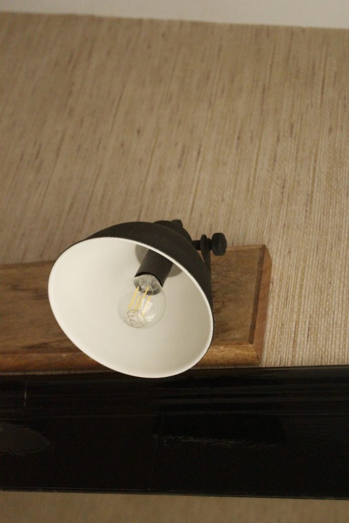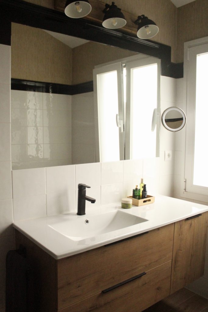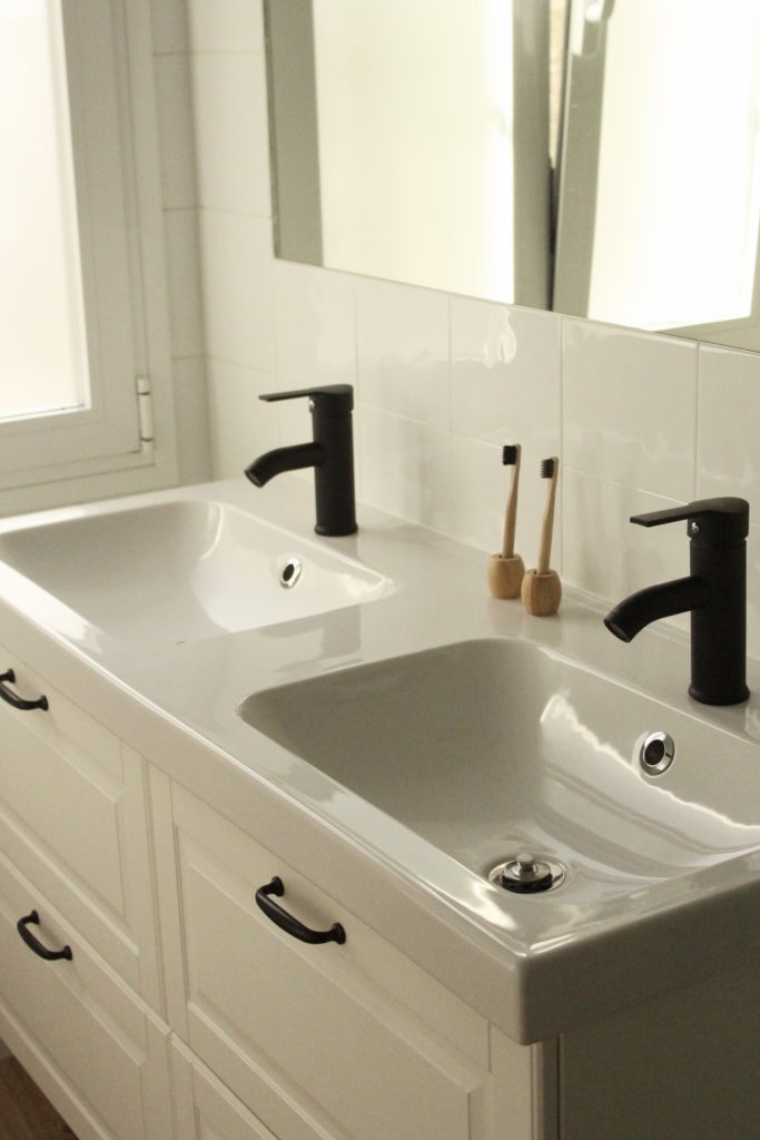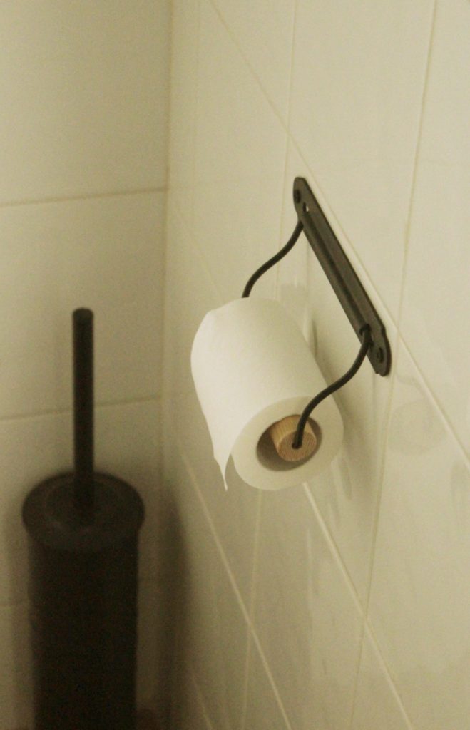 En el baño principal se ha optado por un papel pintado de fibra natural en acabado bambú, los accesorios y grifería se ha puesto de color negro y la cenefa antigua se ha pintado de gris antracita . El lavabo también es nuevo en madera y cerámica blanca. En este baño se ha cambiado el sanitario y se optado por poner un grifo bidé.